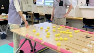 こんにちは! 今回はみんなで協力ゲームを行いました! みんなで手をつないで輪になり、フラフ ...