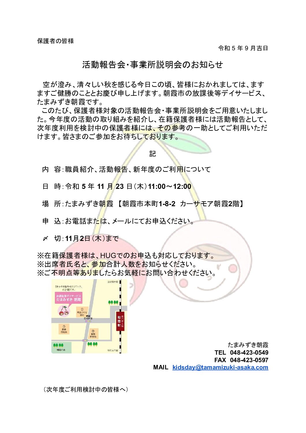 今回は事業所説明会のご案内です。今回の説明会では、日常の活動の様子や次年度のご案内等をお知 ...