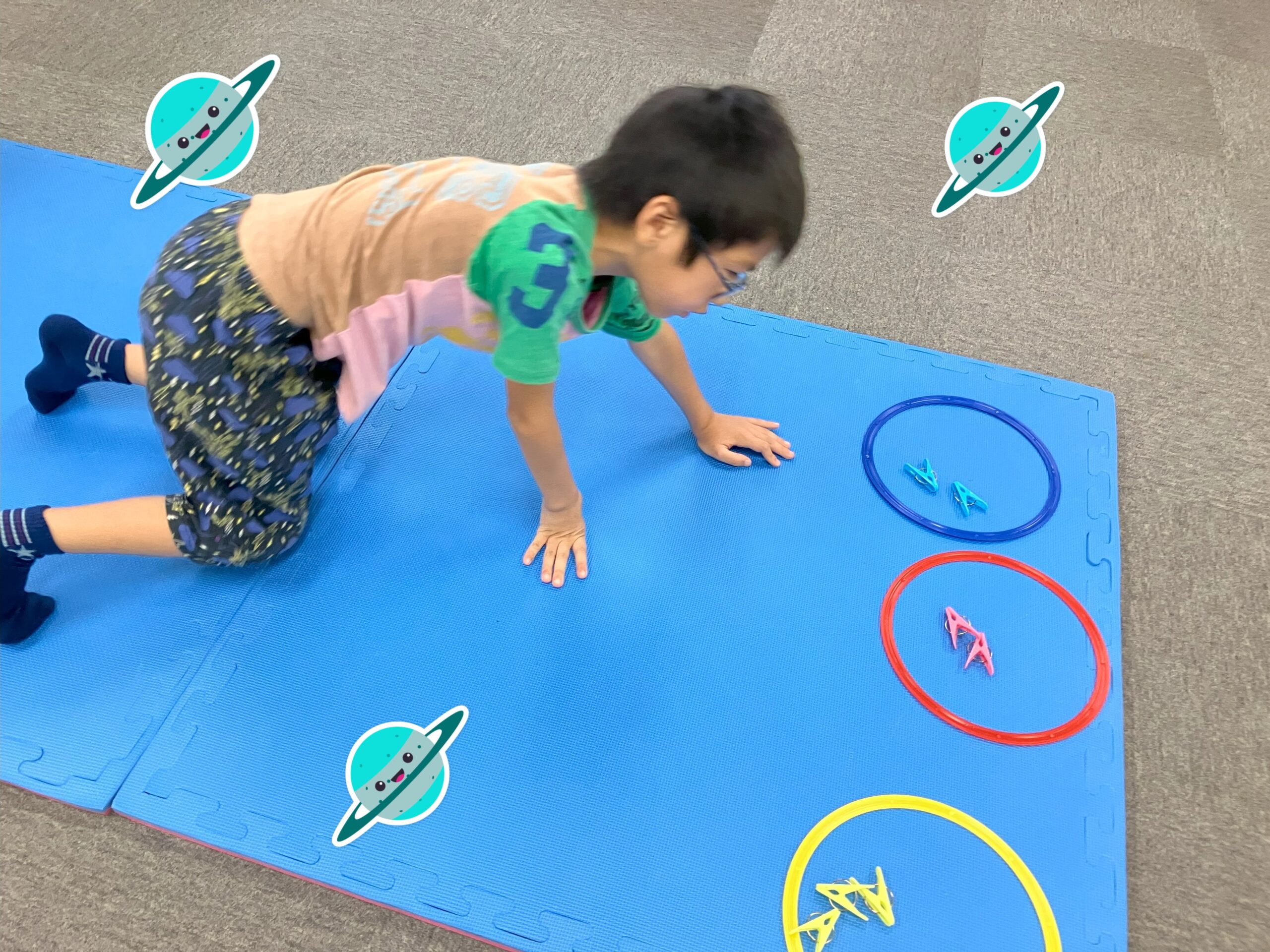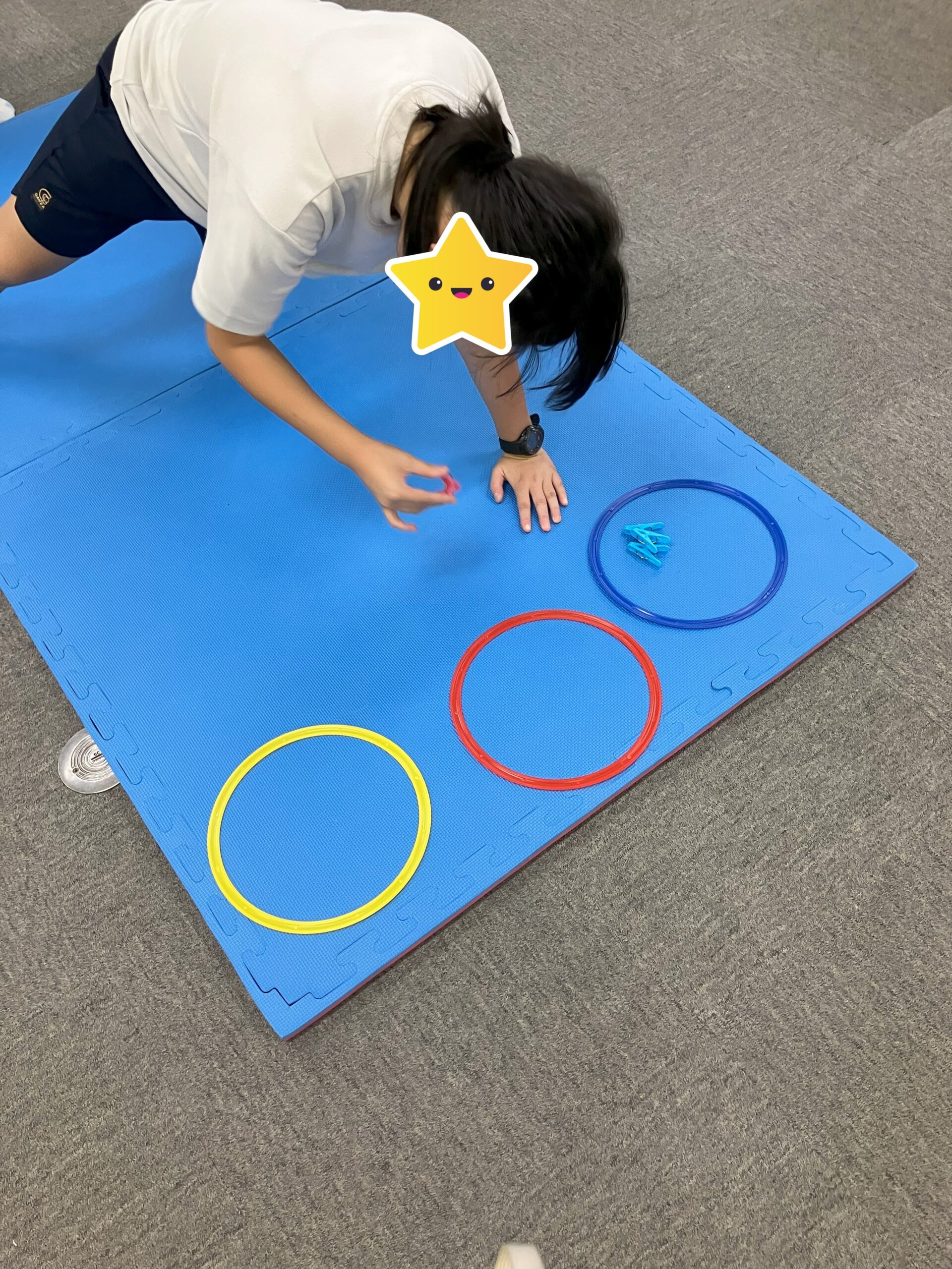 こちらの活動は、洋服に挟んだ洗濯ばさみを外して、色を合わせてフープに入れるという活動でした。皆さん脱落することなく、最後までやり遂げてくださいました!