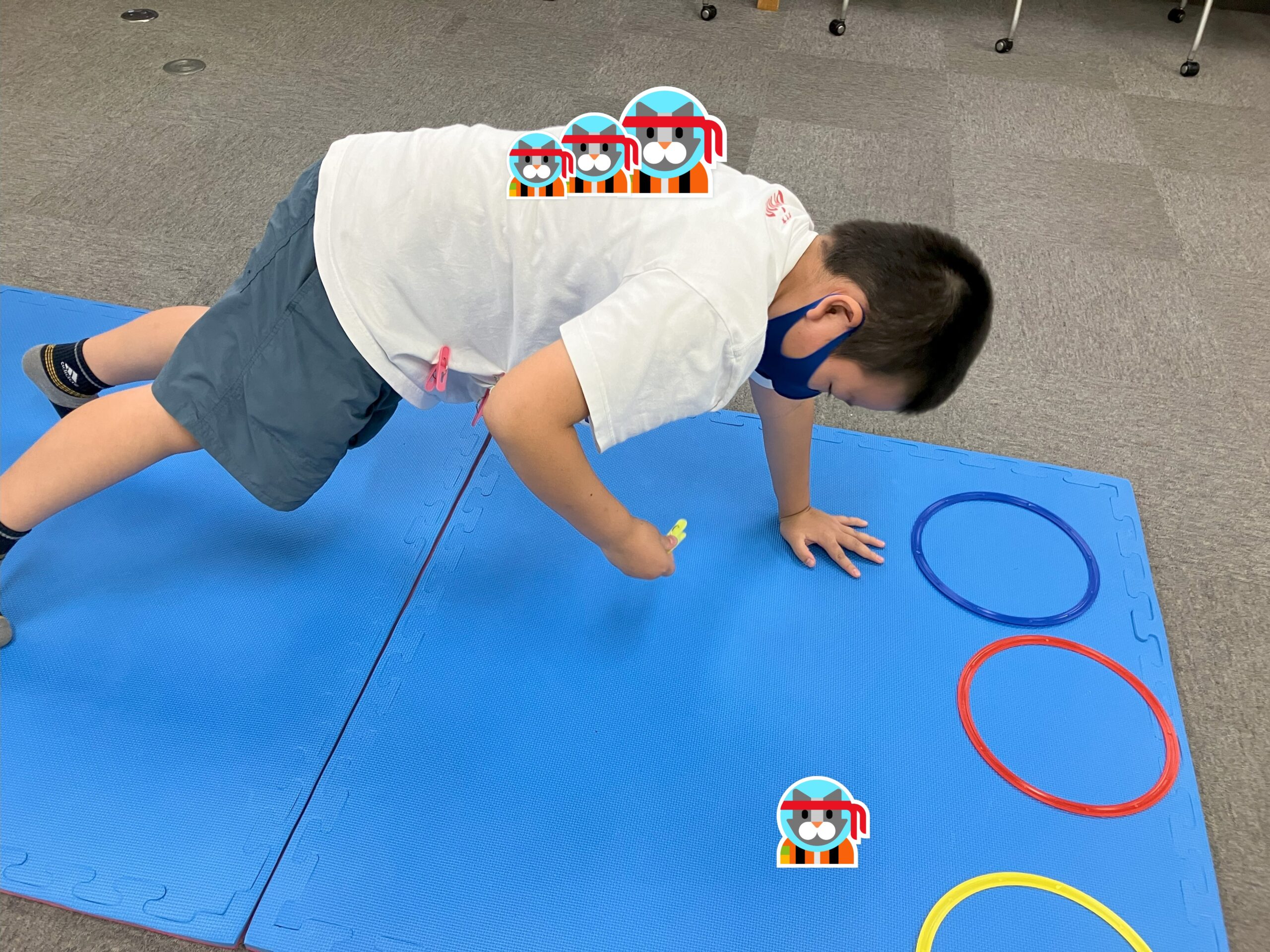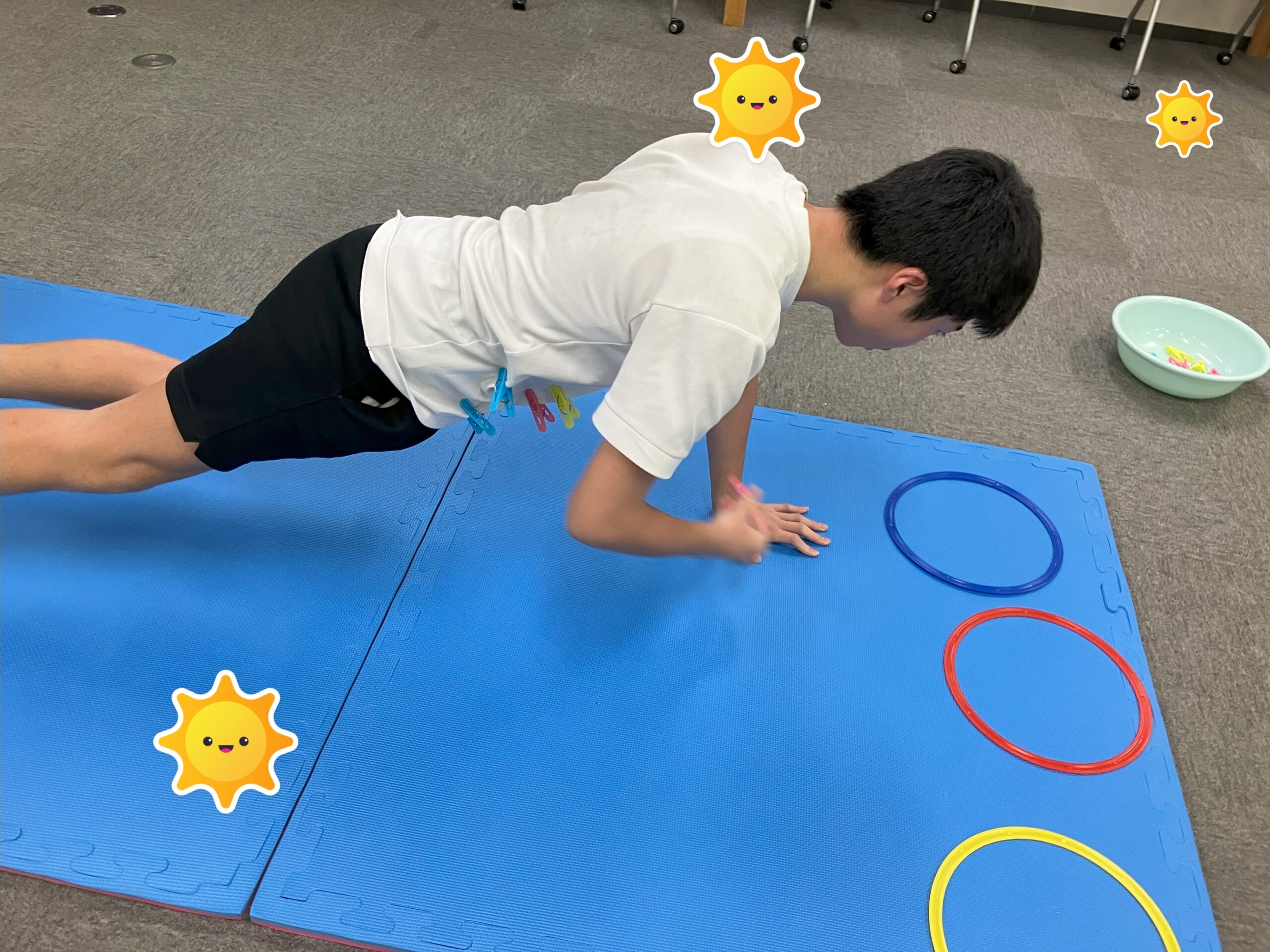 たまみずき朝霞では、先日体幹トレーニングを行いました!何やら皆さん、下を向きながら片手で体を支えていますね。