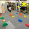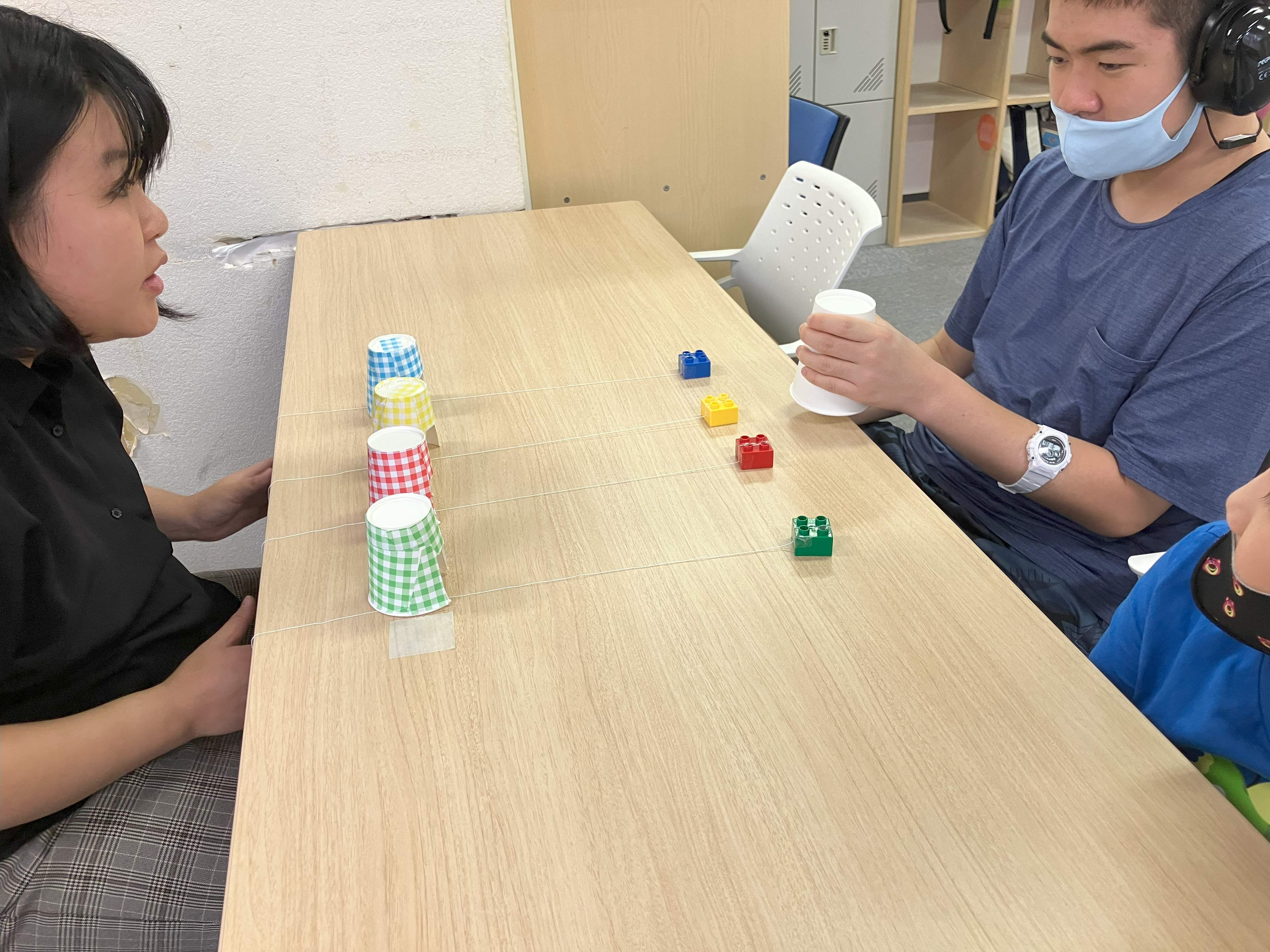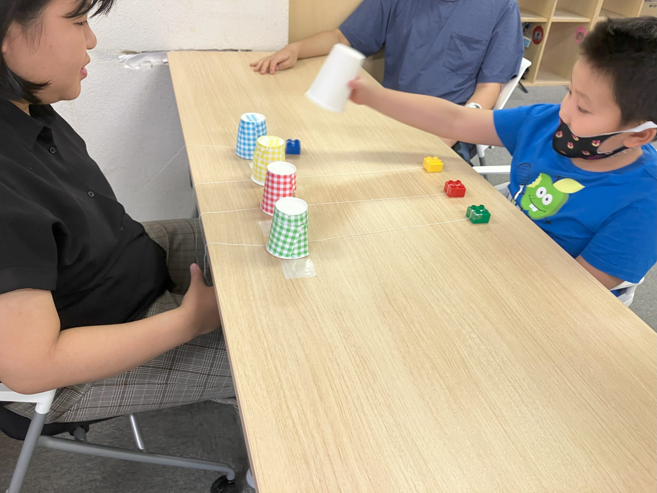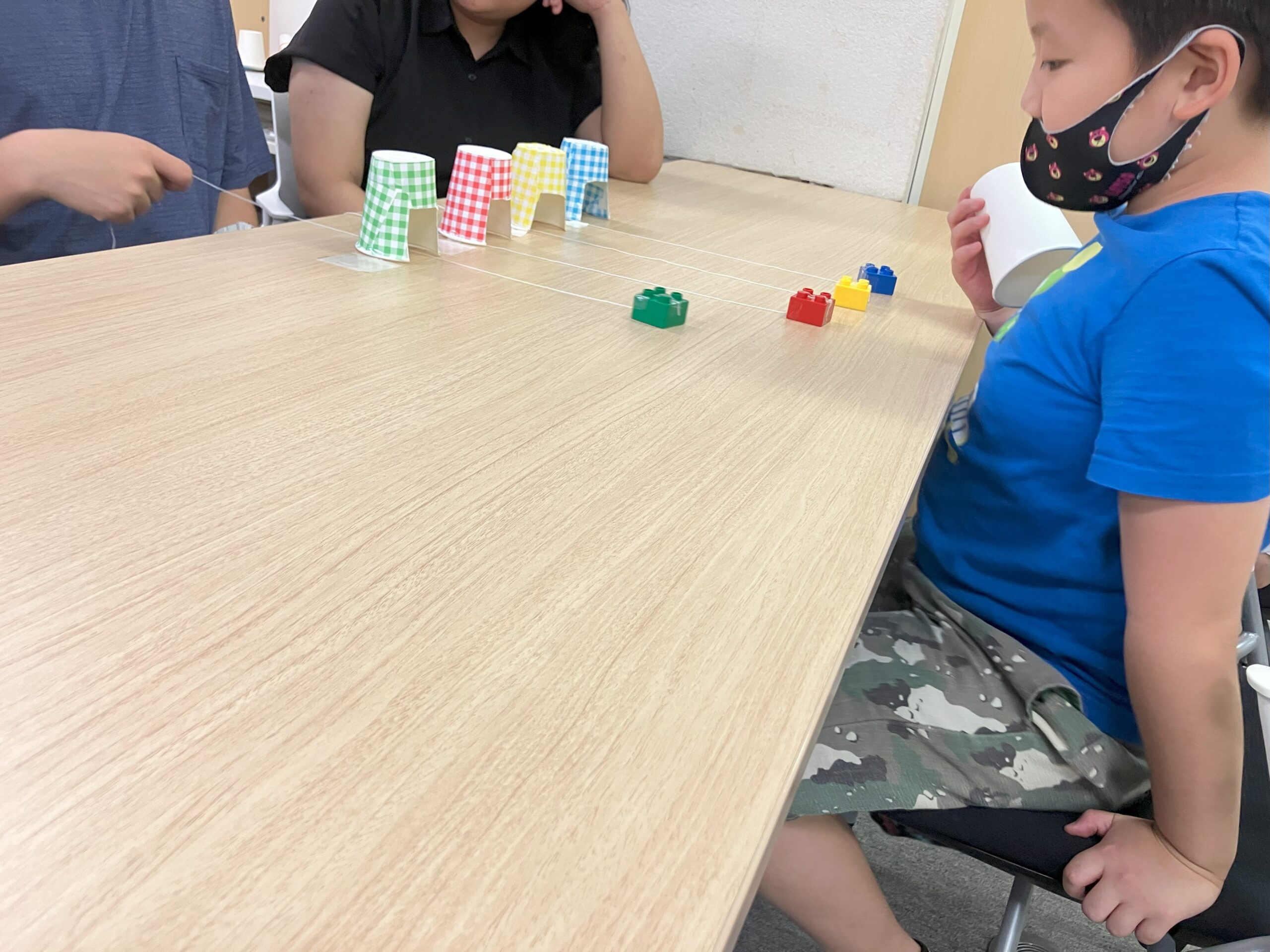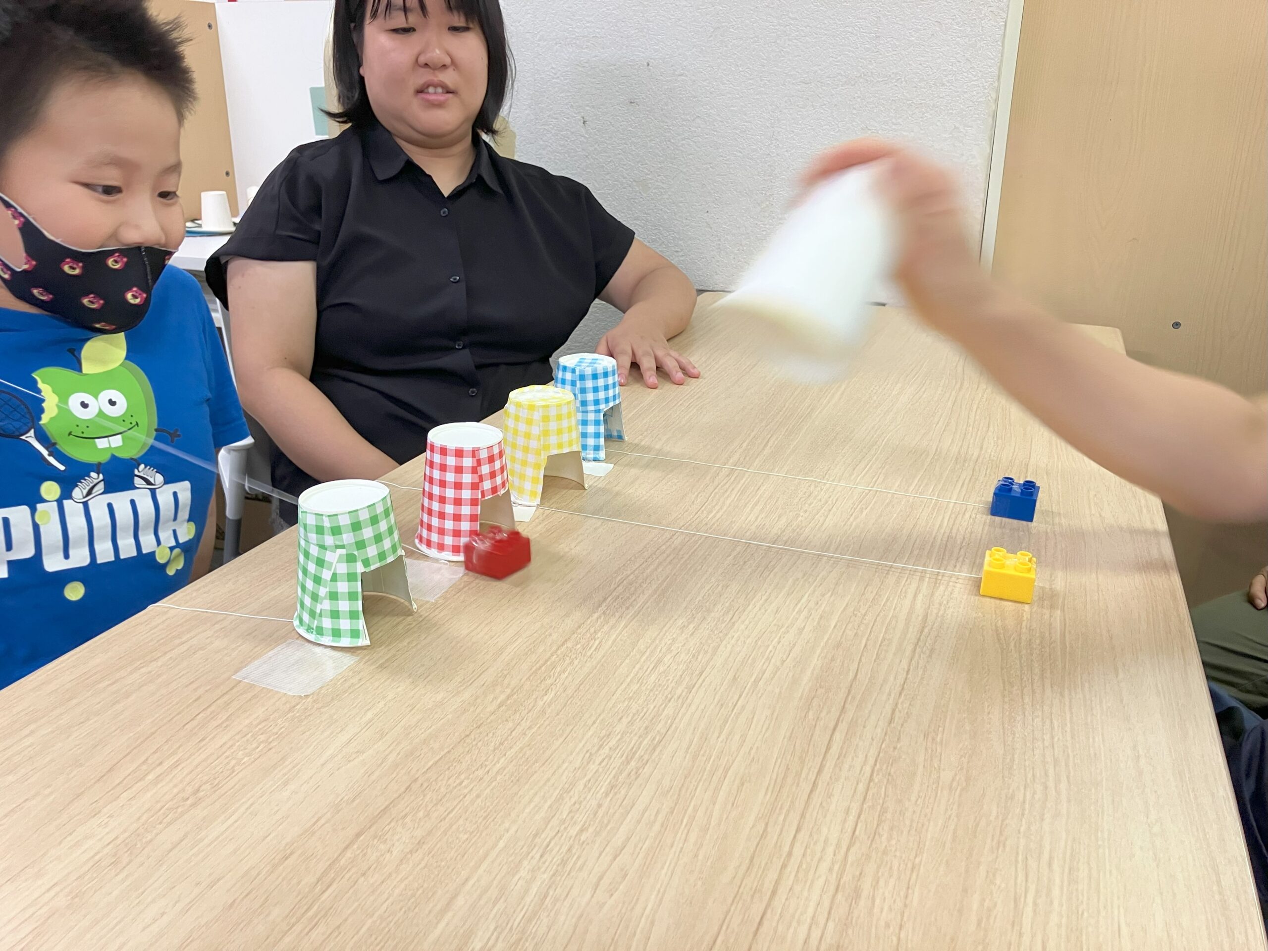 4色のコップに合わせたブロックを紐で繋げ、職員が紐を引っ張ります