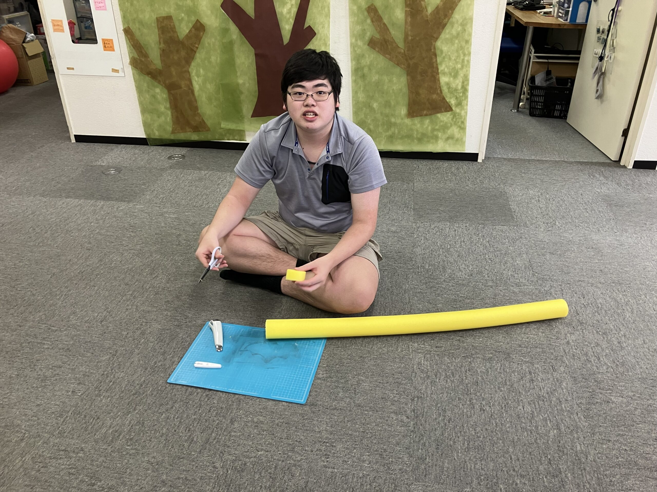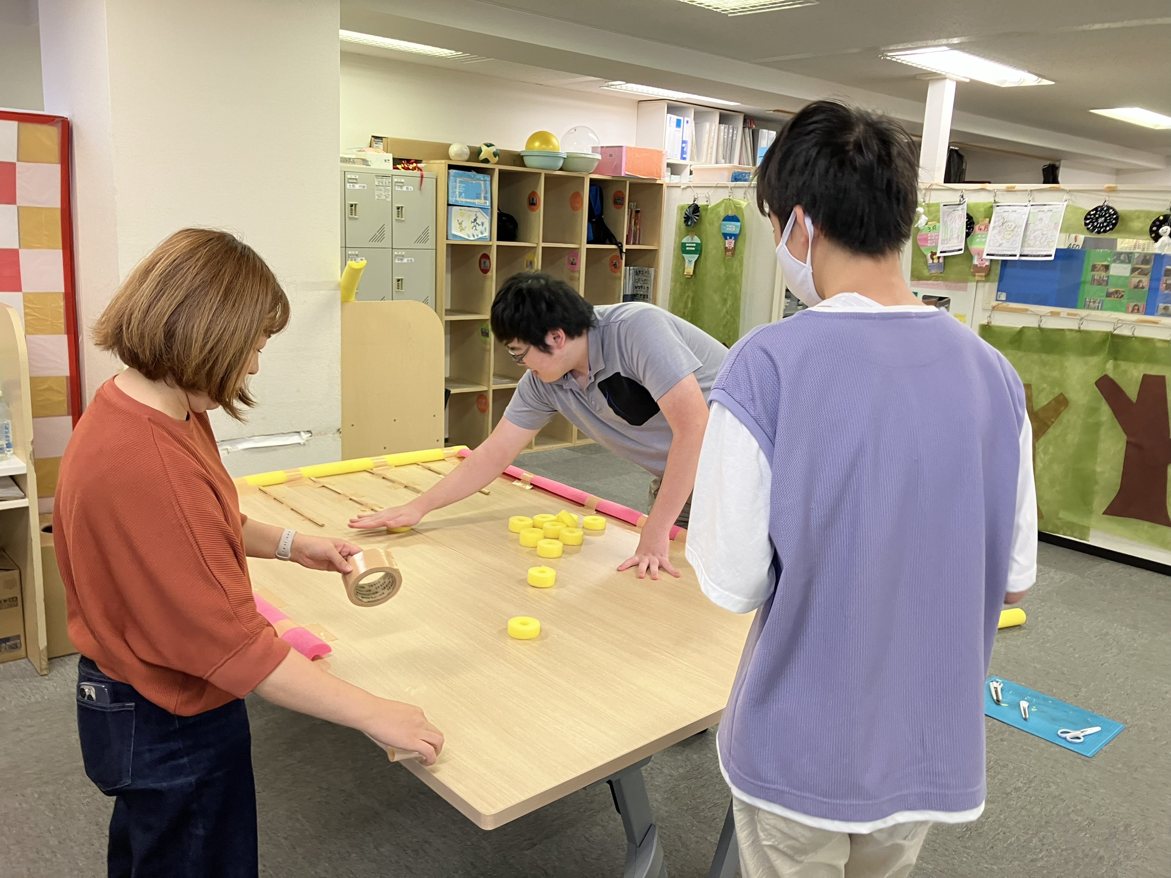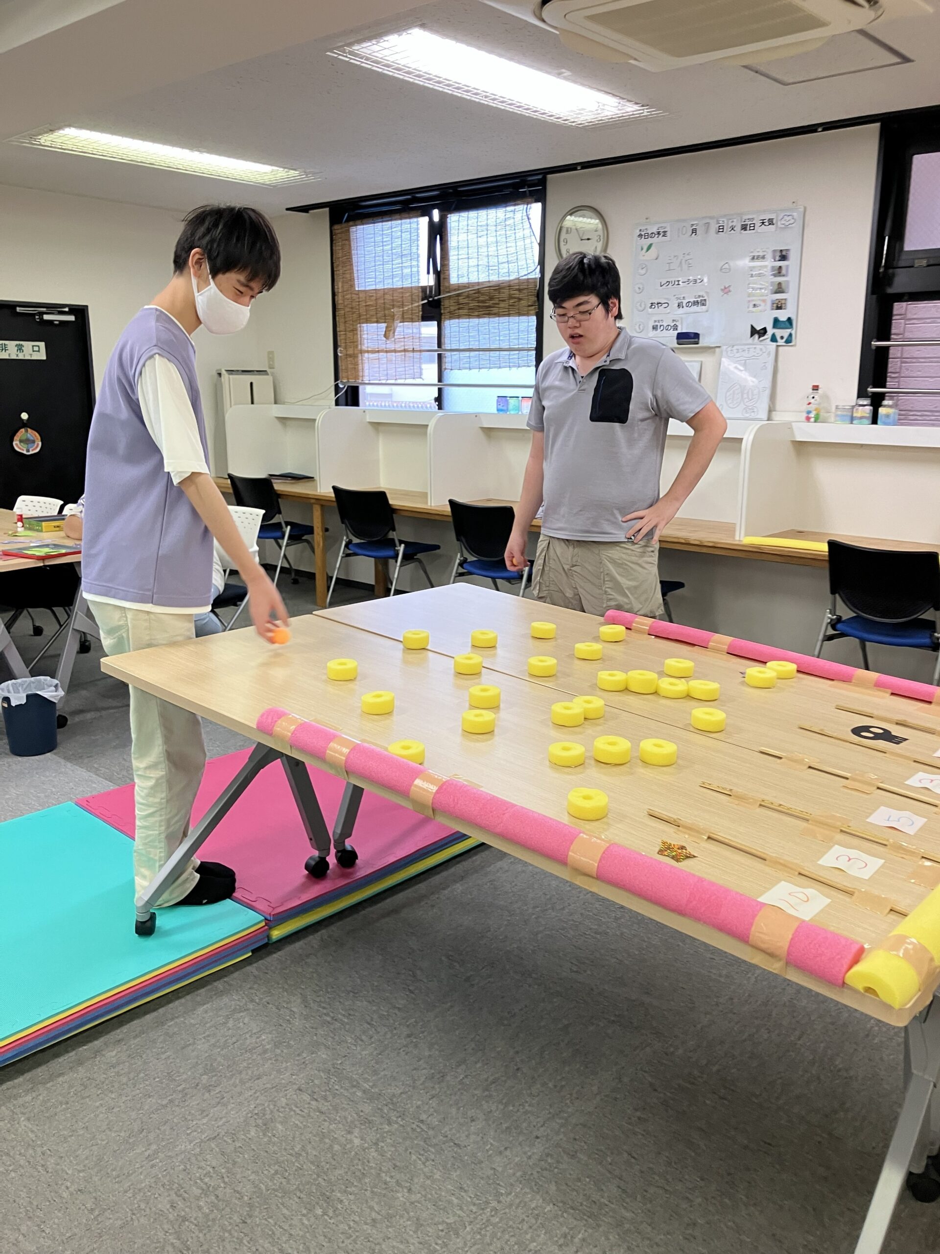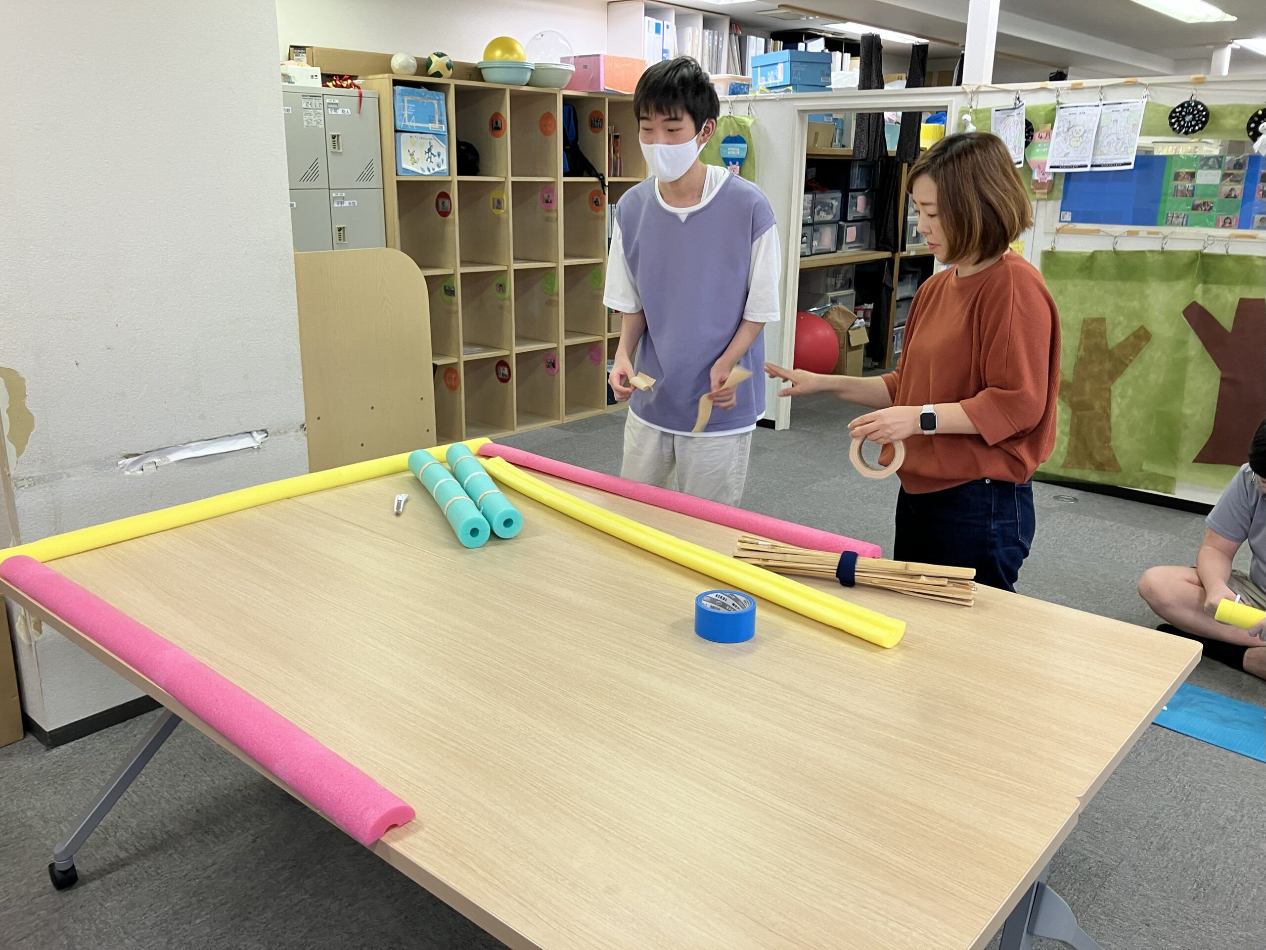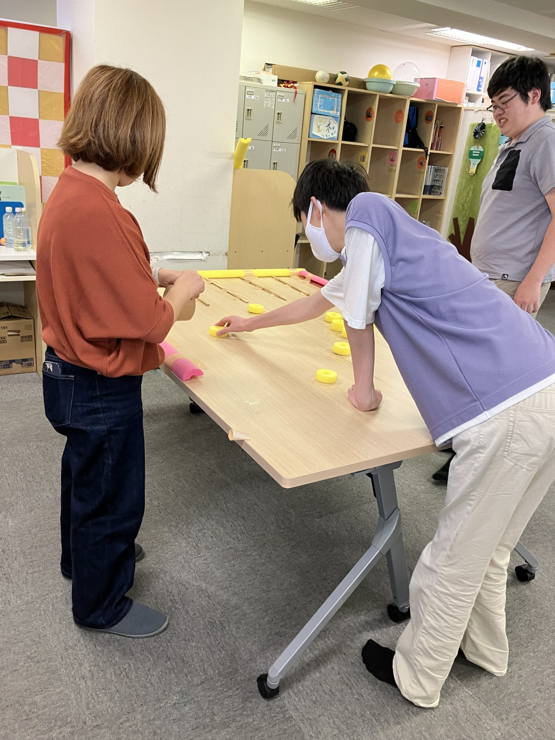 今回は高校生のお兄さんたちに、プールスティックを使ってピンボールを作りました!