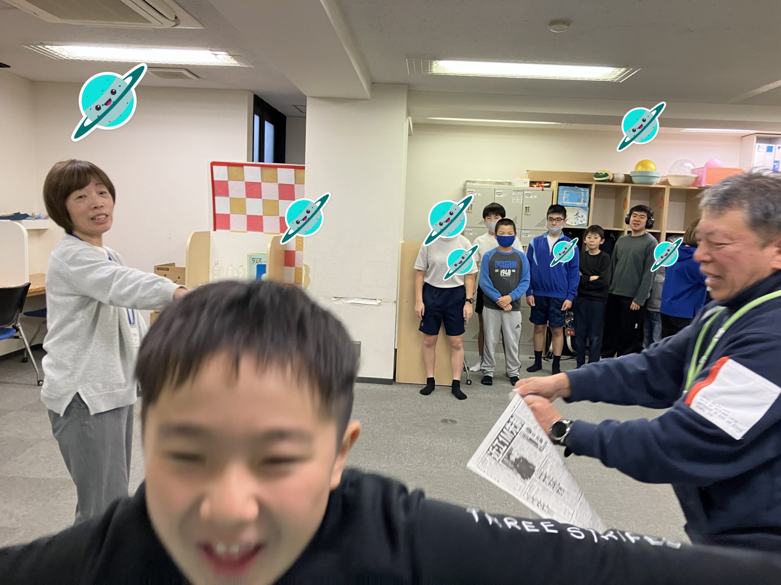 裂いた新聞紙は、シャワーのように浴びてみました。紙吹雪に見立てて祝福の言葉かけをしていた方もいましたね。