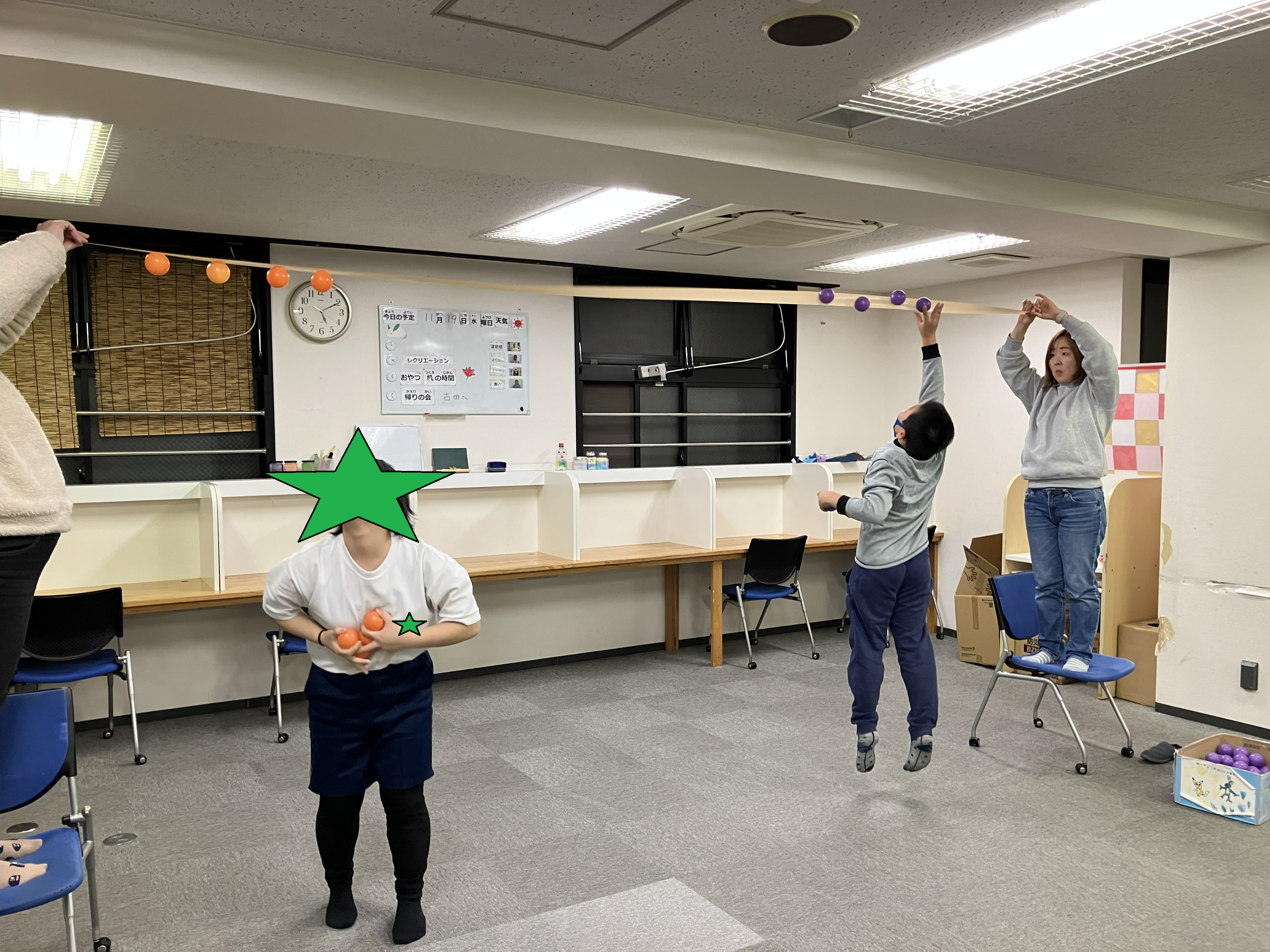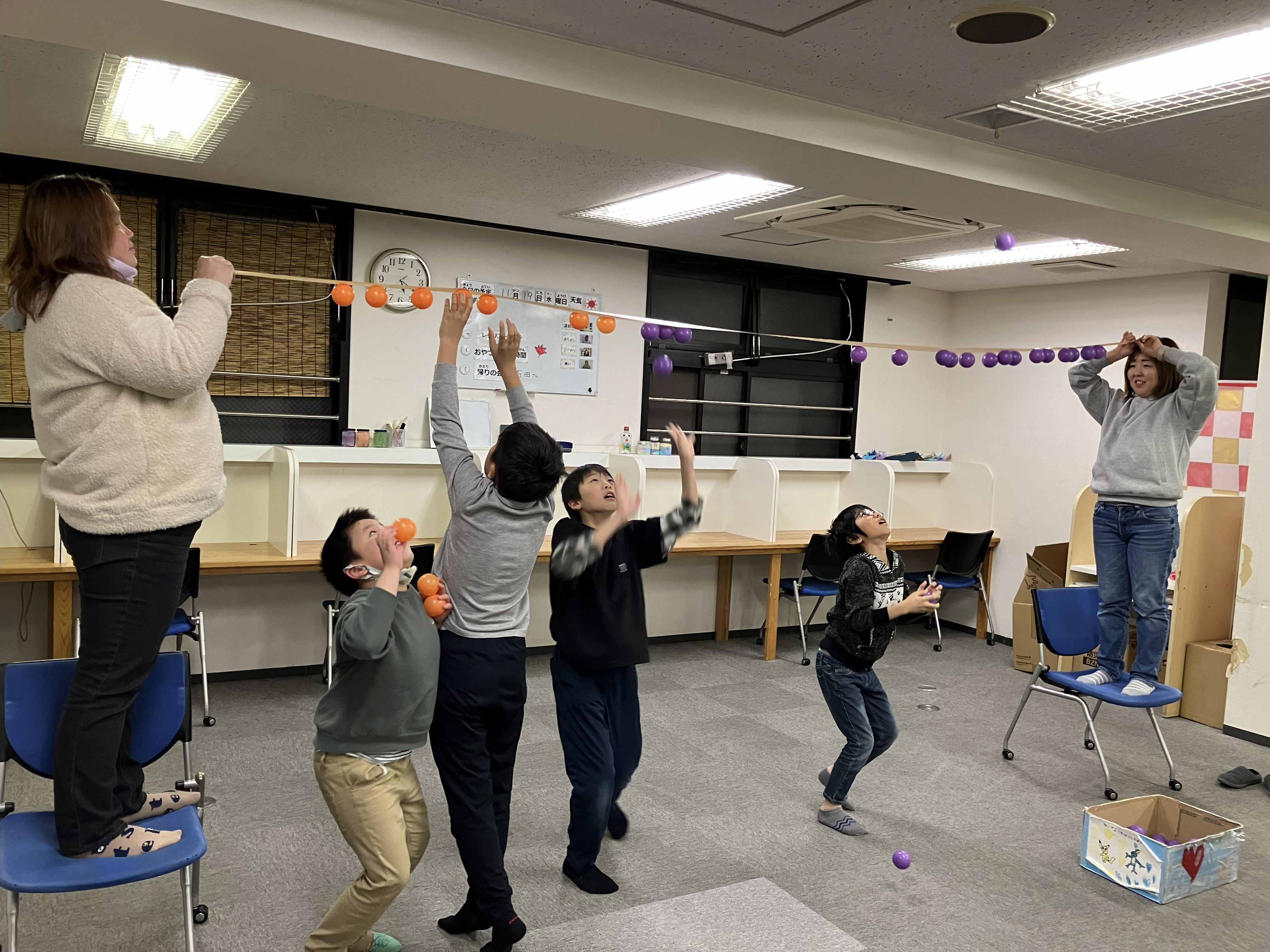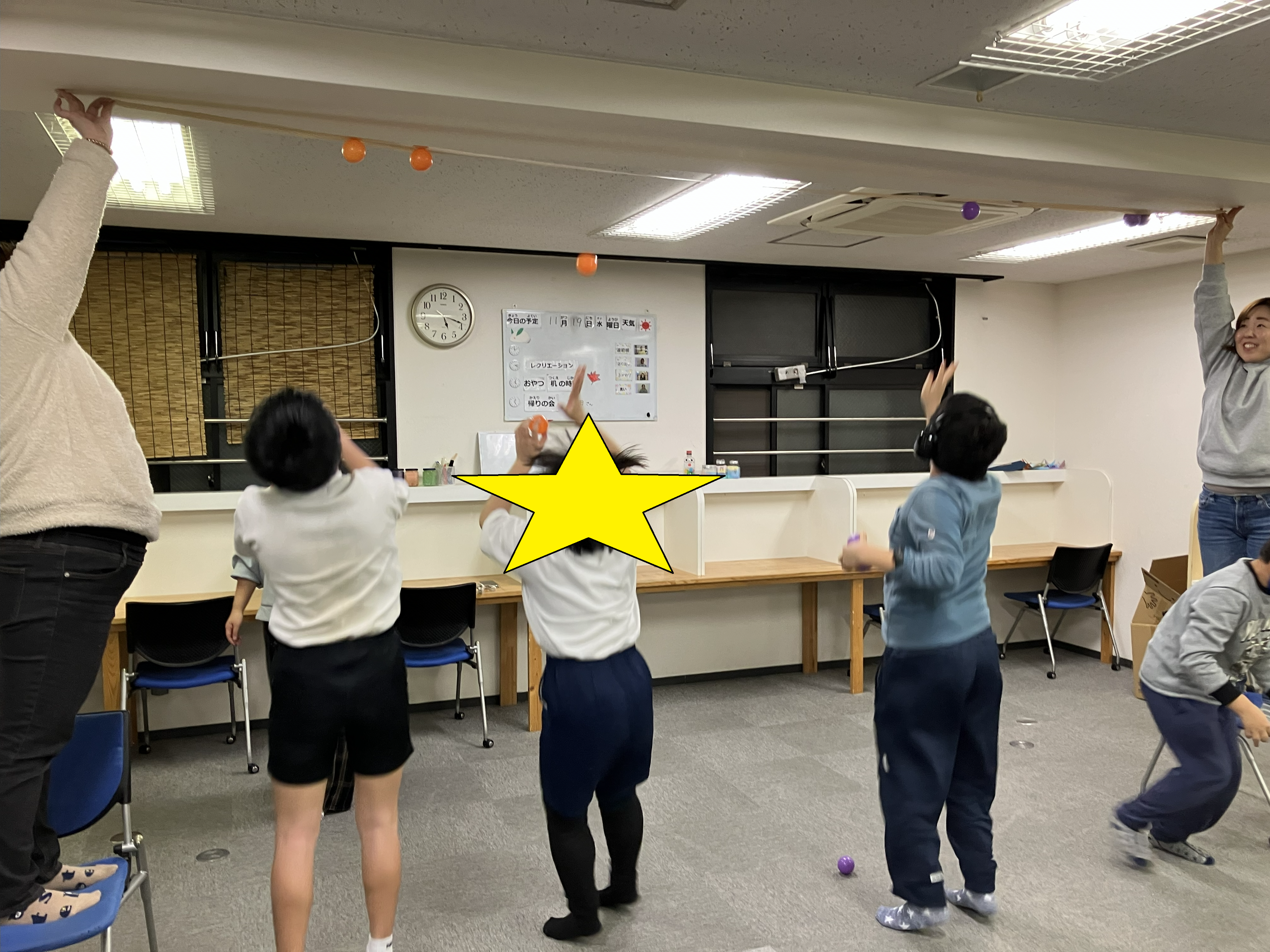 職員さんが持ったガムテープにボールをたくさんつけるゲームを行いました!