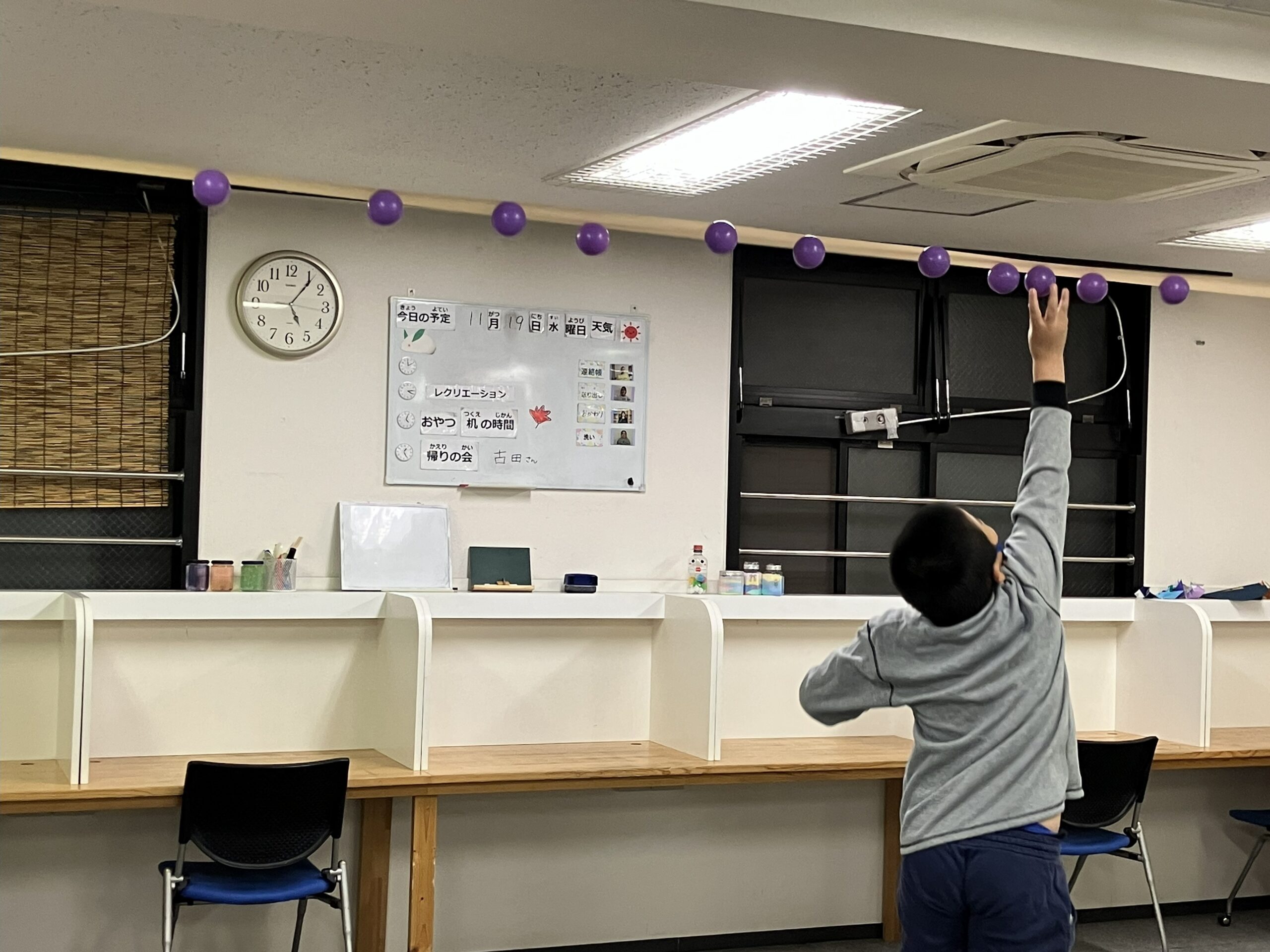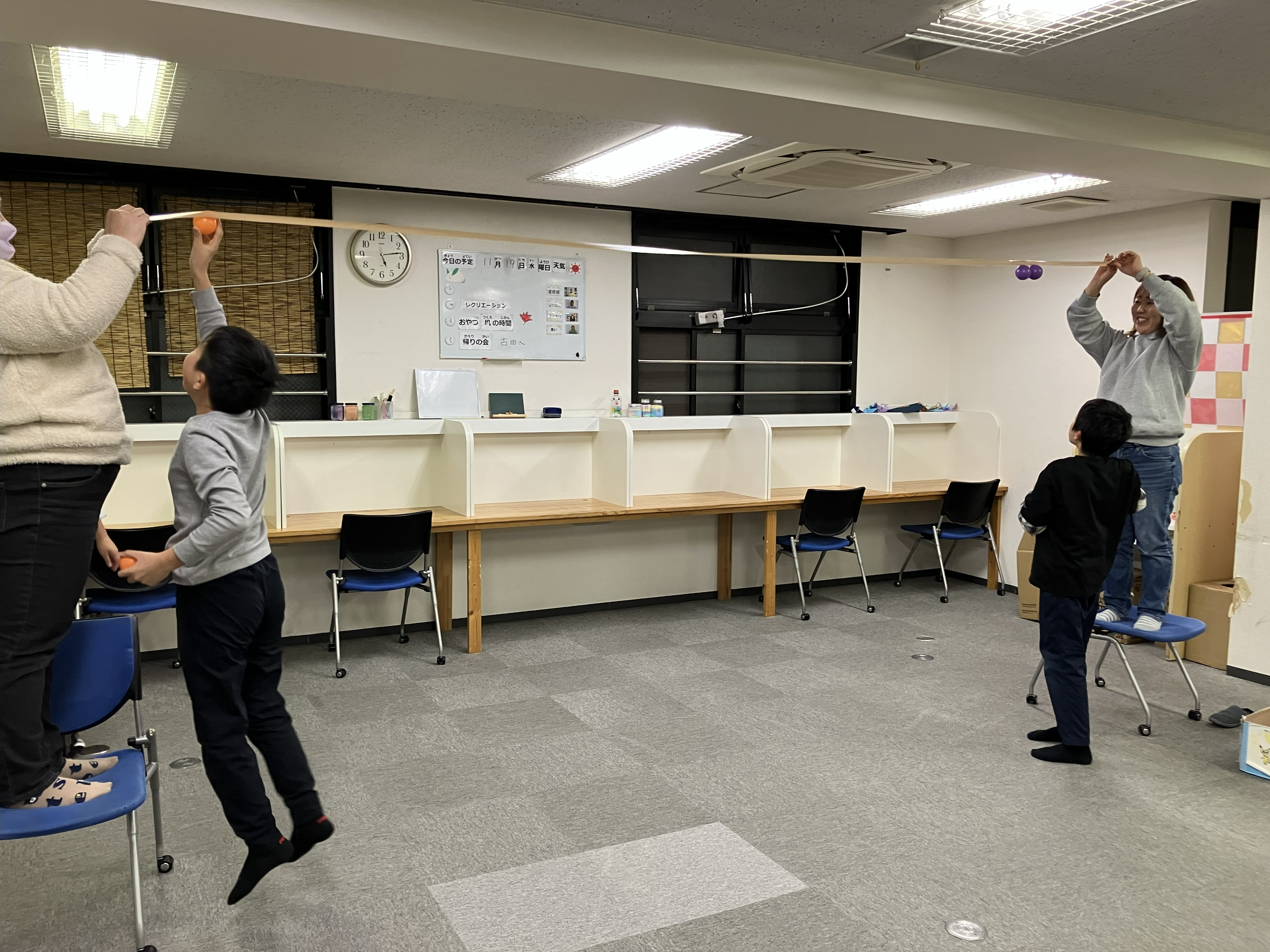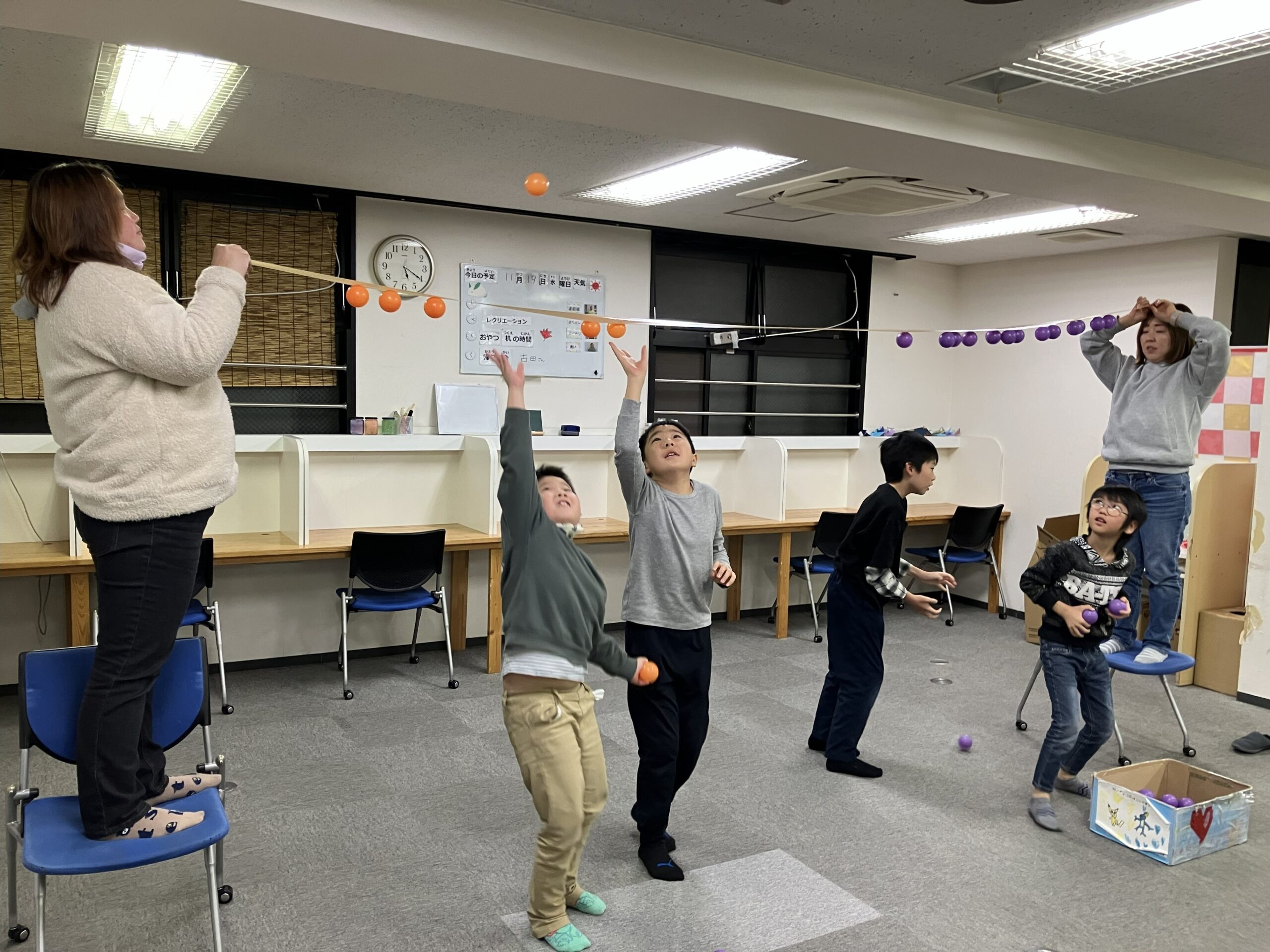 職員さんが持ったガムテープにボールをたくさんつけるゲームを行いました!