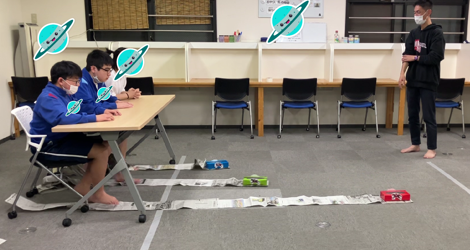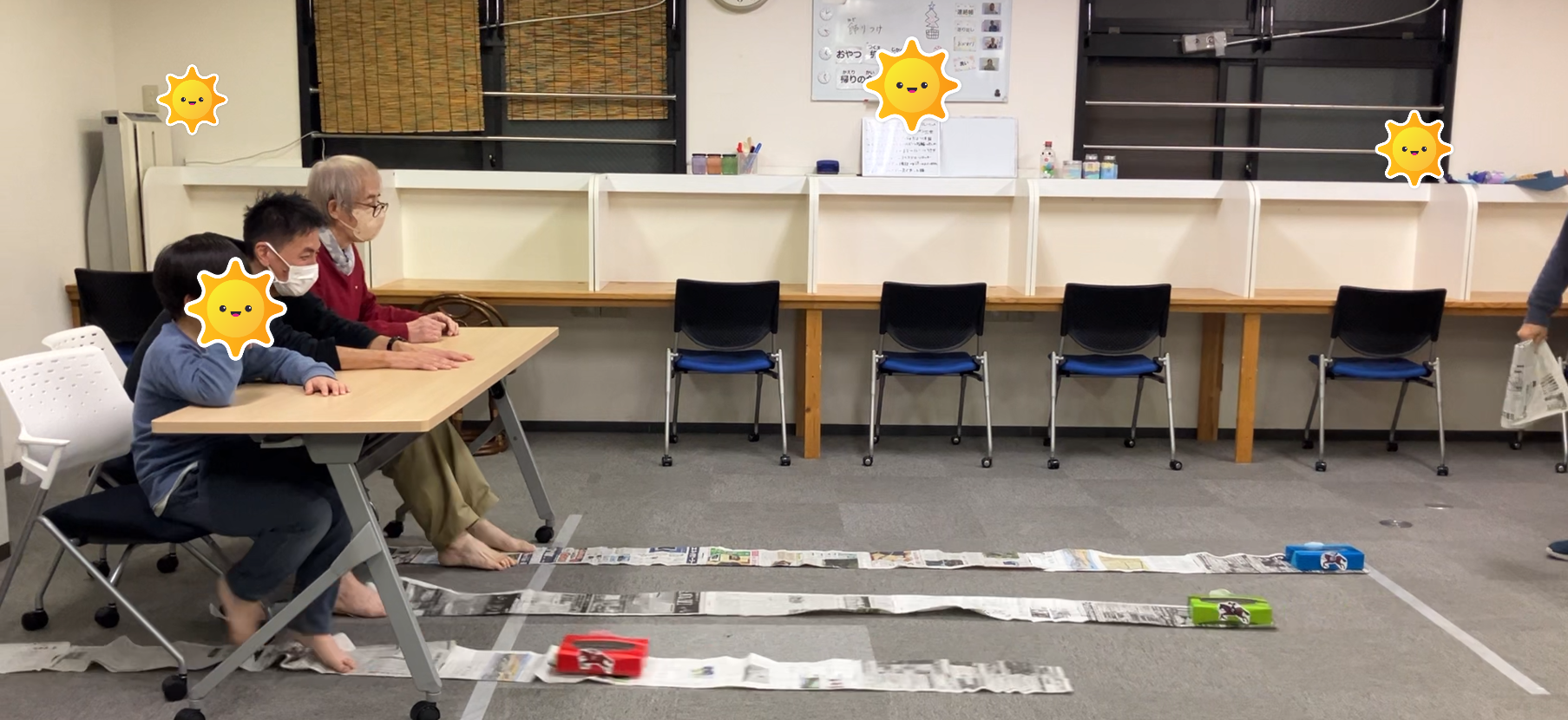 ということで、新聞紙を引き寄せて、ティッシュ箱をゴールまで導く活動でした。