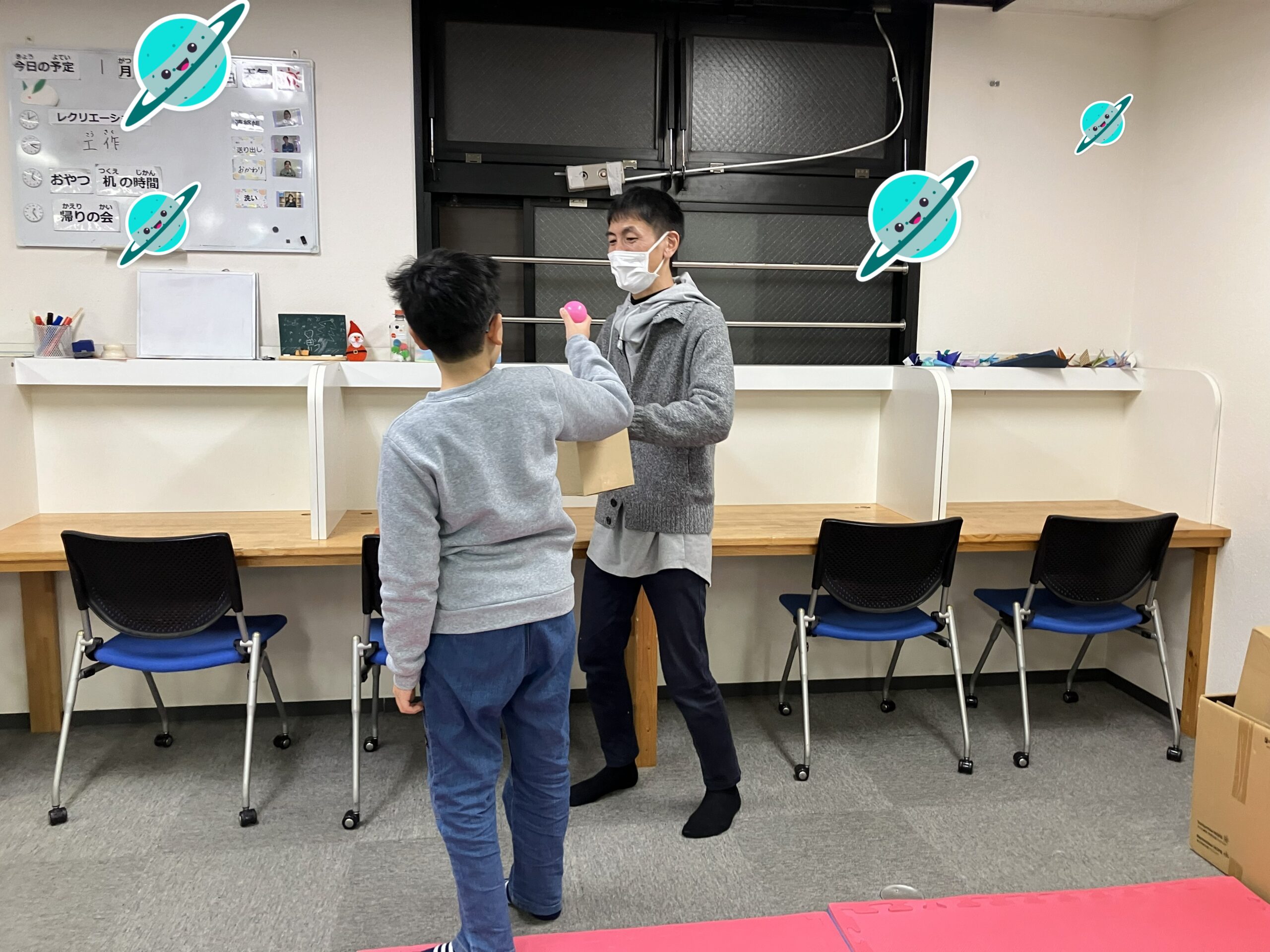 進むためには、最初に自分たちのチームカラーのボールを選ぶことができるかが、ポイントになります。ボールを選んだ後に、「すすむ」カードか「もどる」カードをひいてもらいます。チームカラーのボールと「すすむ」カードをひいたら、1マス進めるというルールで行いました。