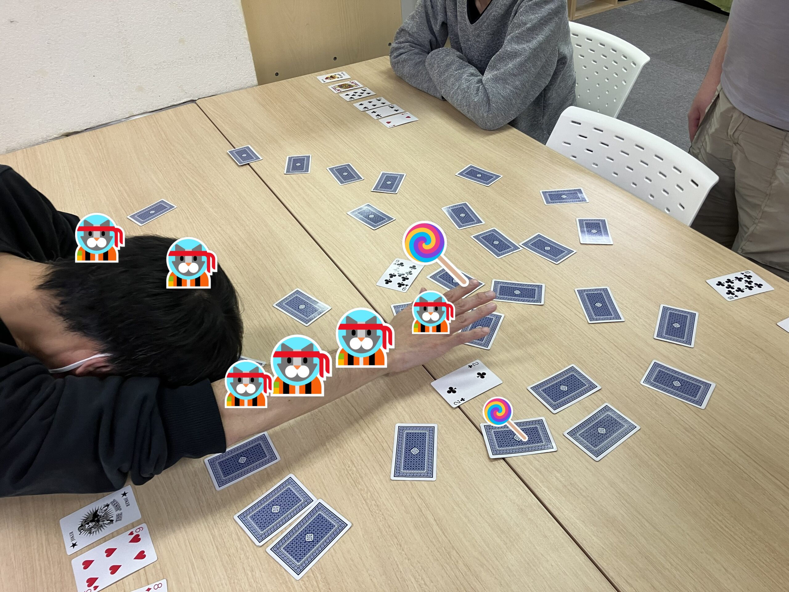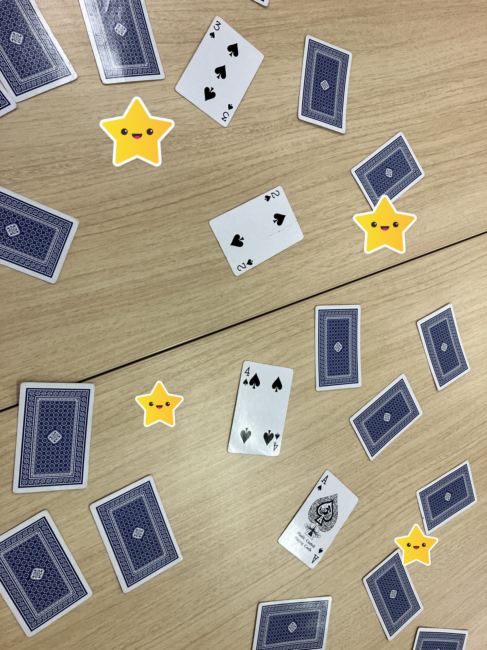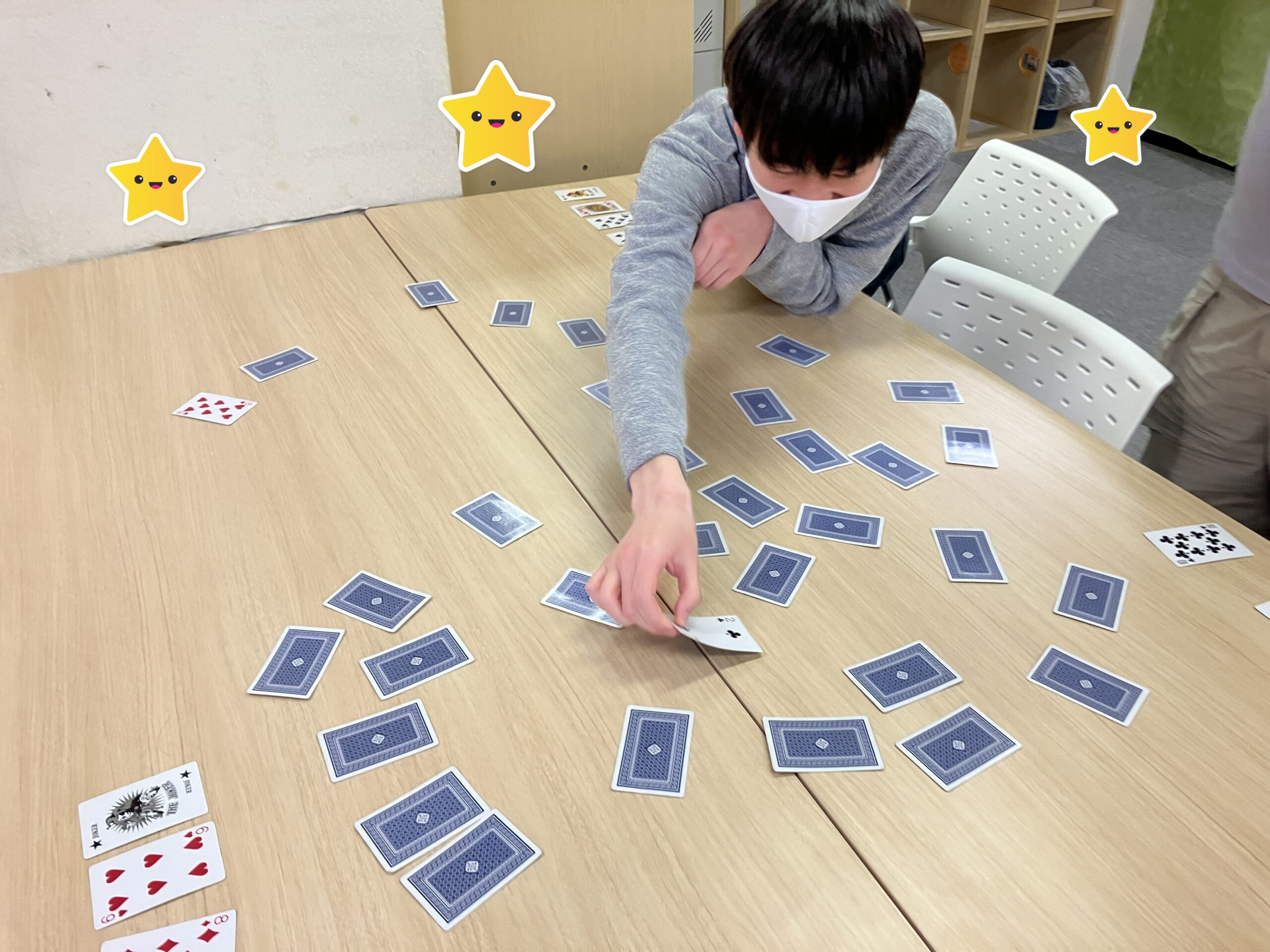 トランプの神経衰弱を応用して、出た数の合計が10になったらカードをゲットし、枚数の合計を勝負するゲームに挑戦しました。