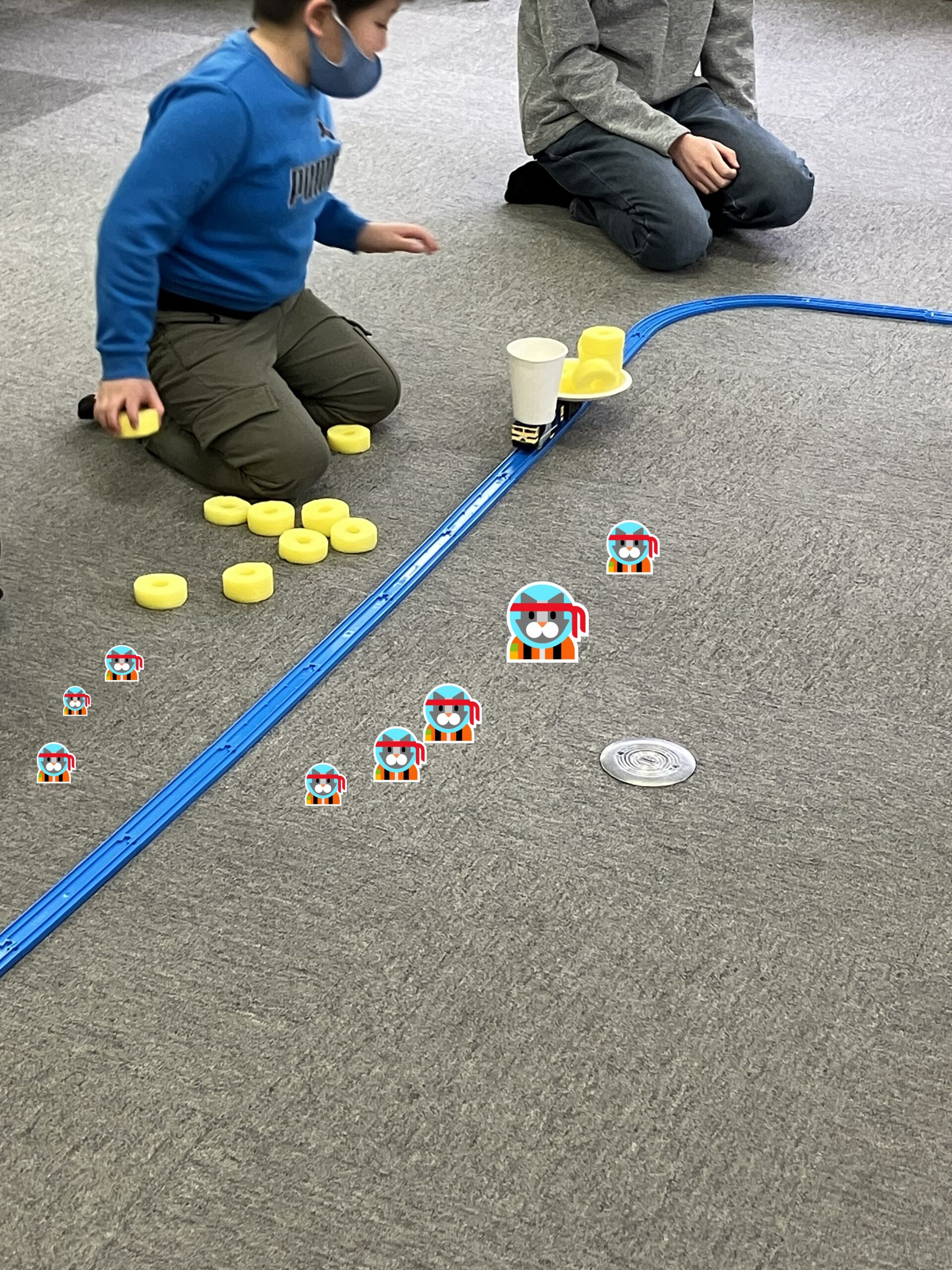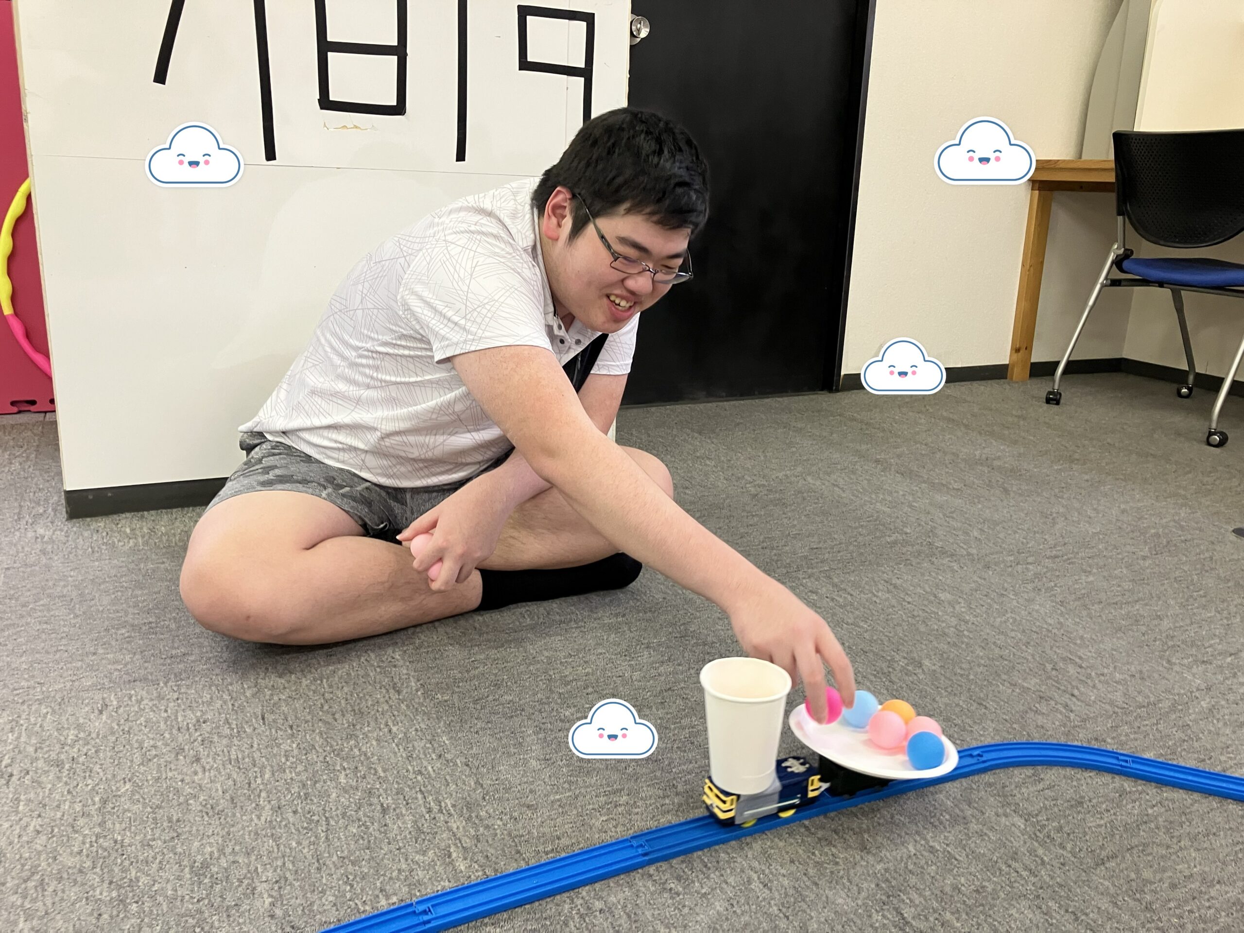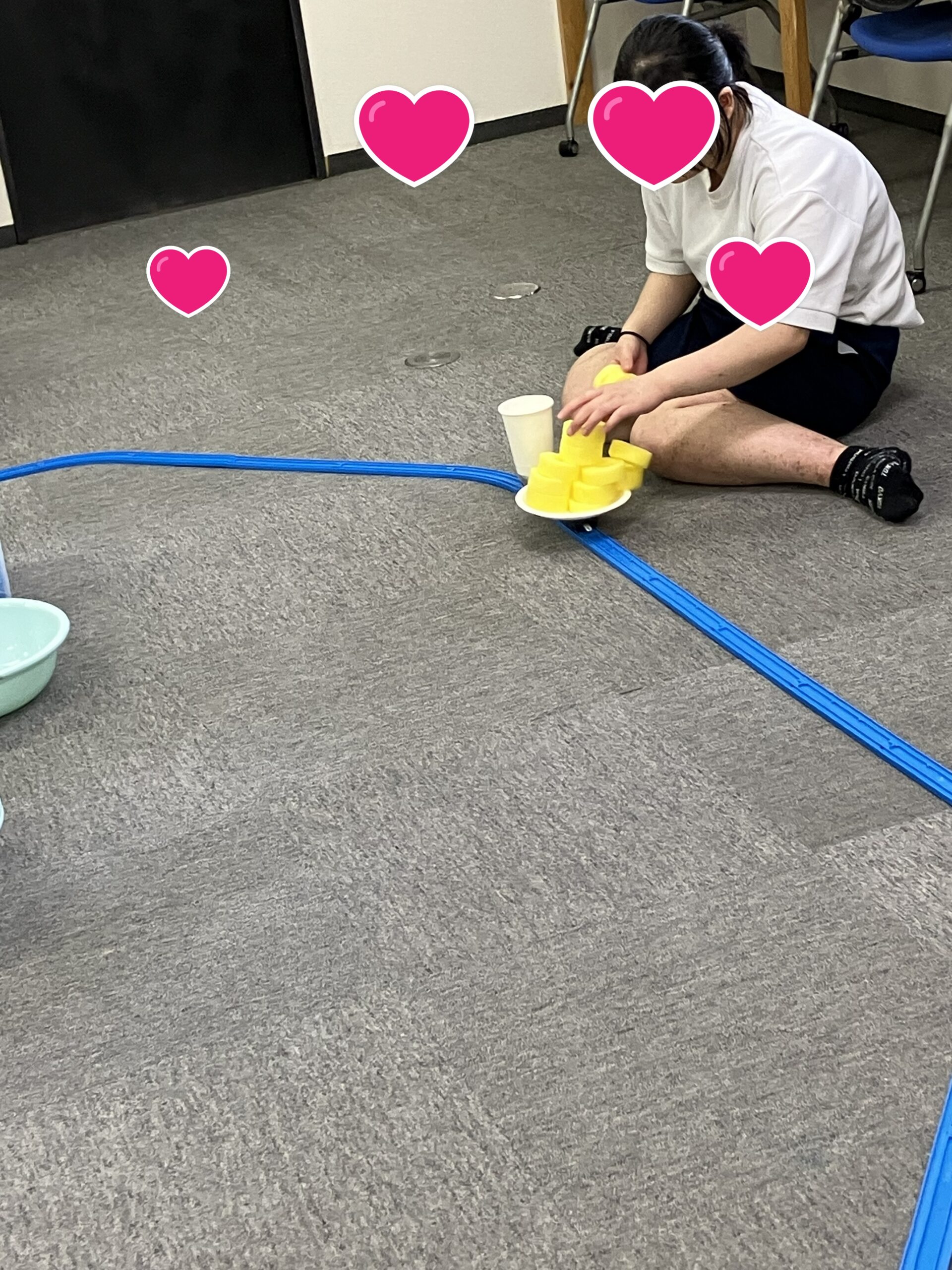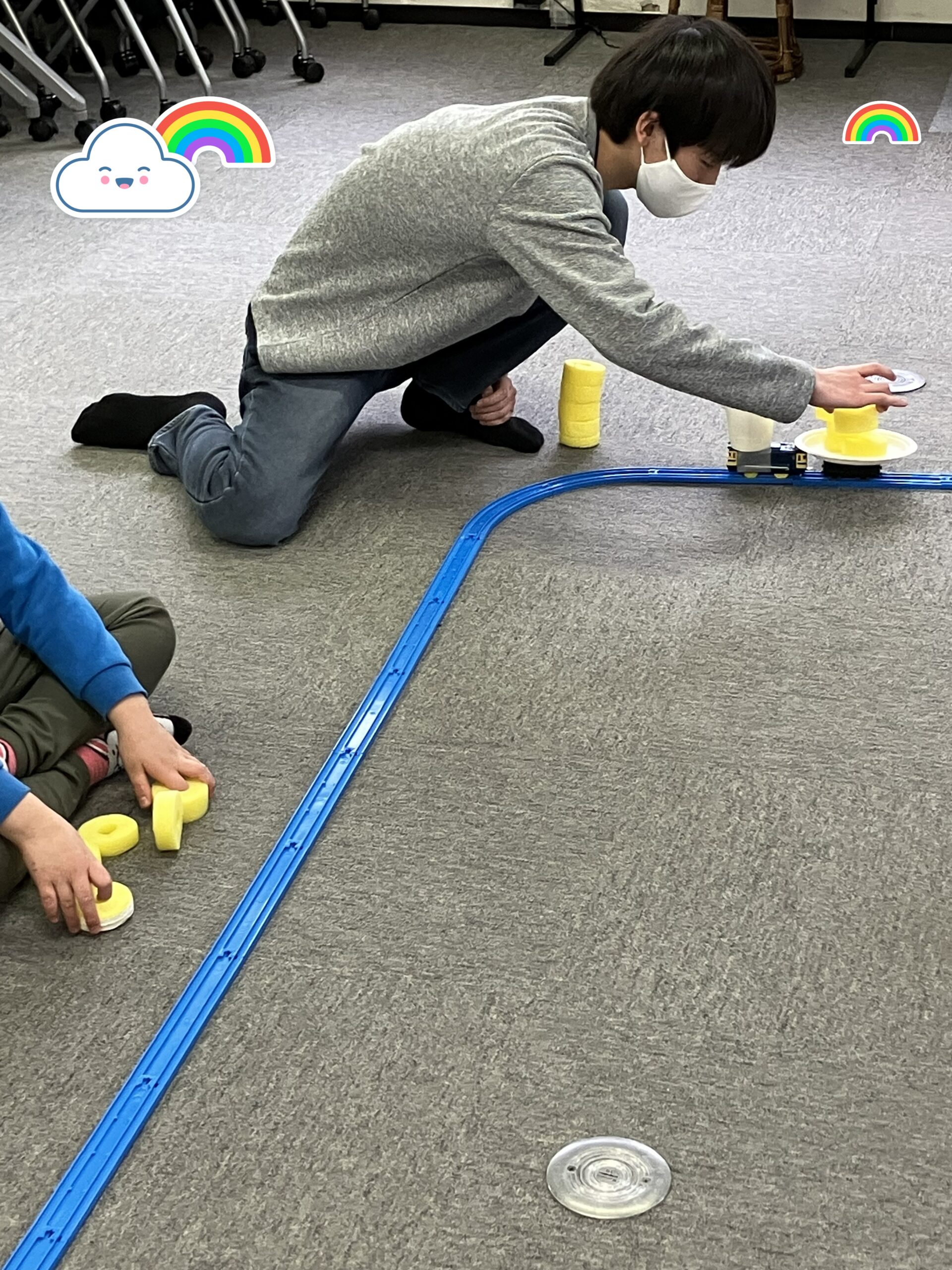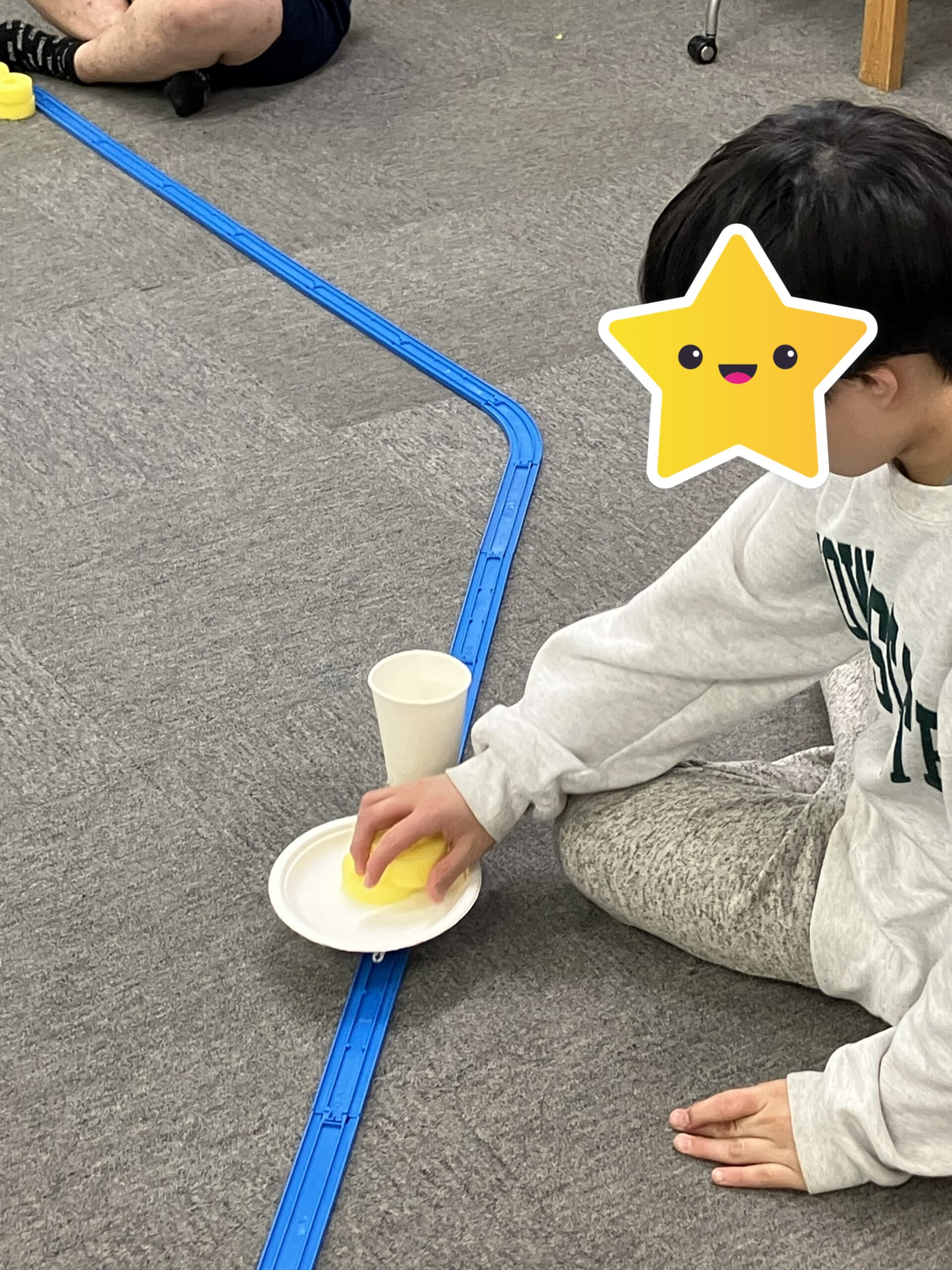 プラレールに紙皿と紙コップをつなげ、周回するプラレールに載せていく活動です。