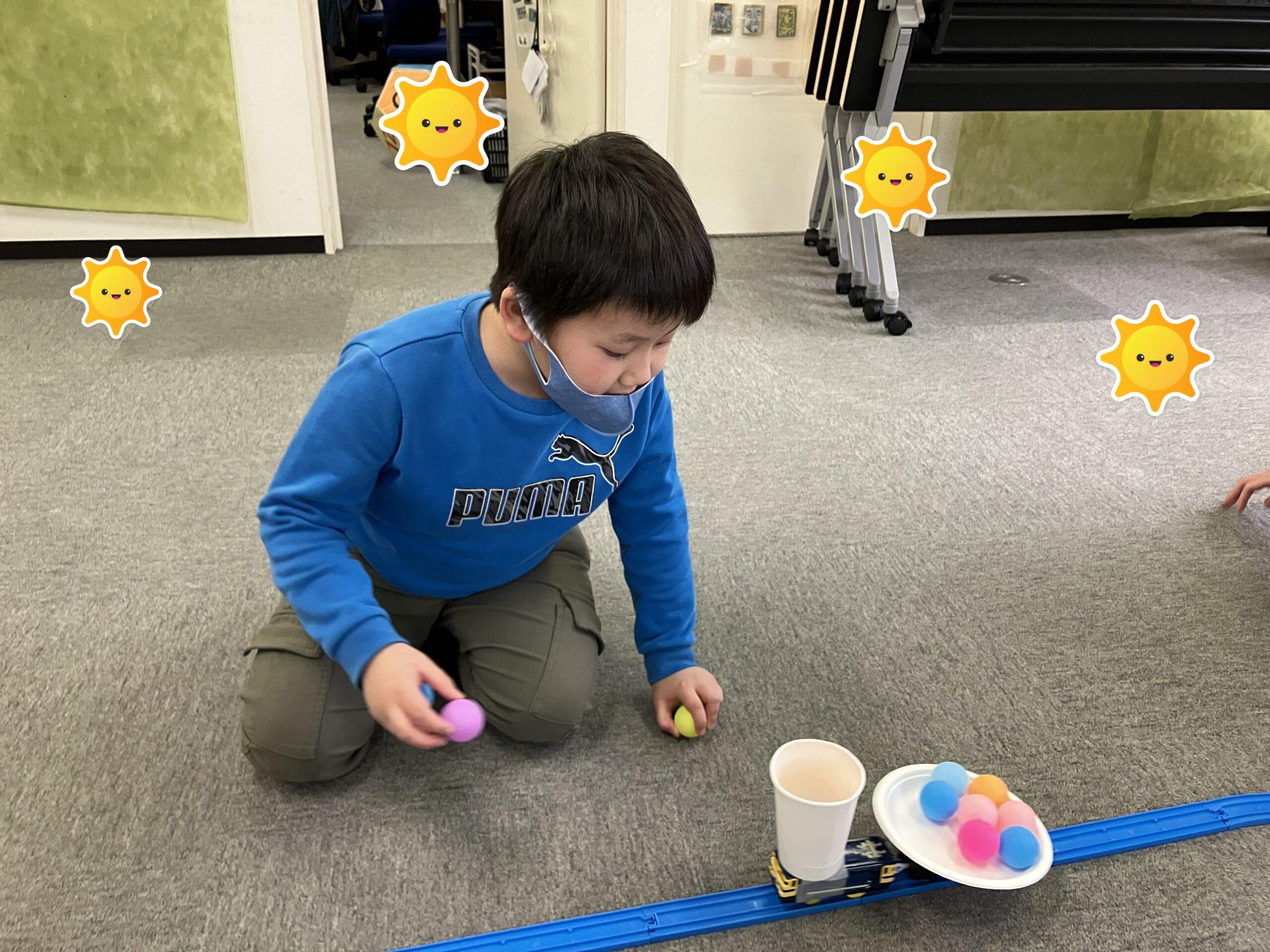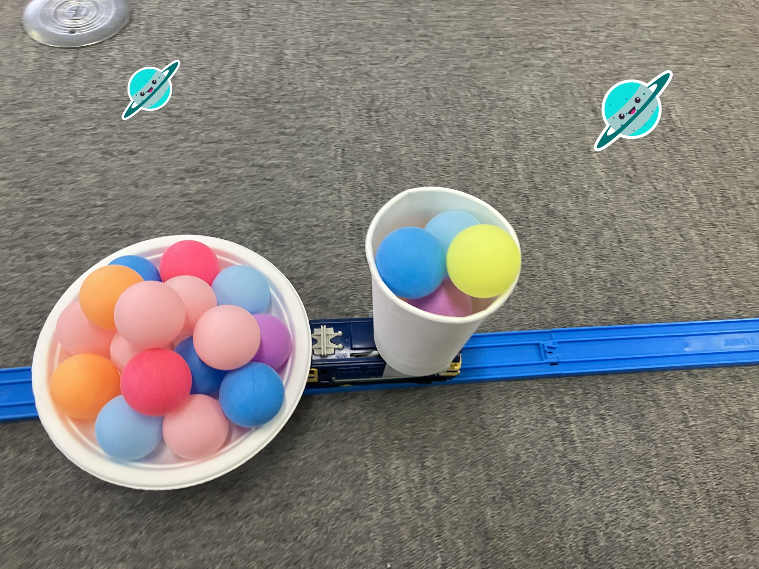 紙コップからはピンポン玉がはみ出し、カーブやプラレール接続箇所の凸凹で大きく揺れるピンポン玉に一喜一憂しながら楽しく挑戦していただきました。お疲れ様でした!