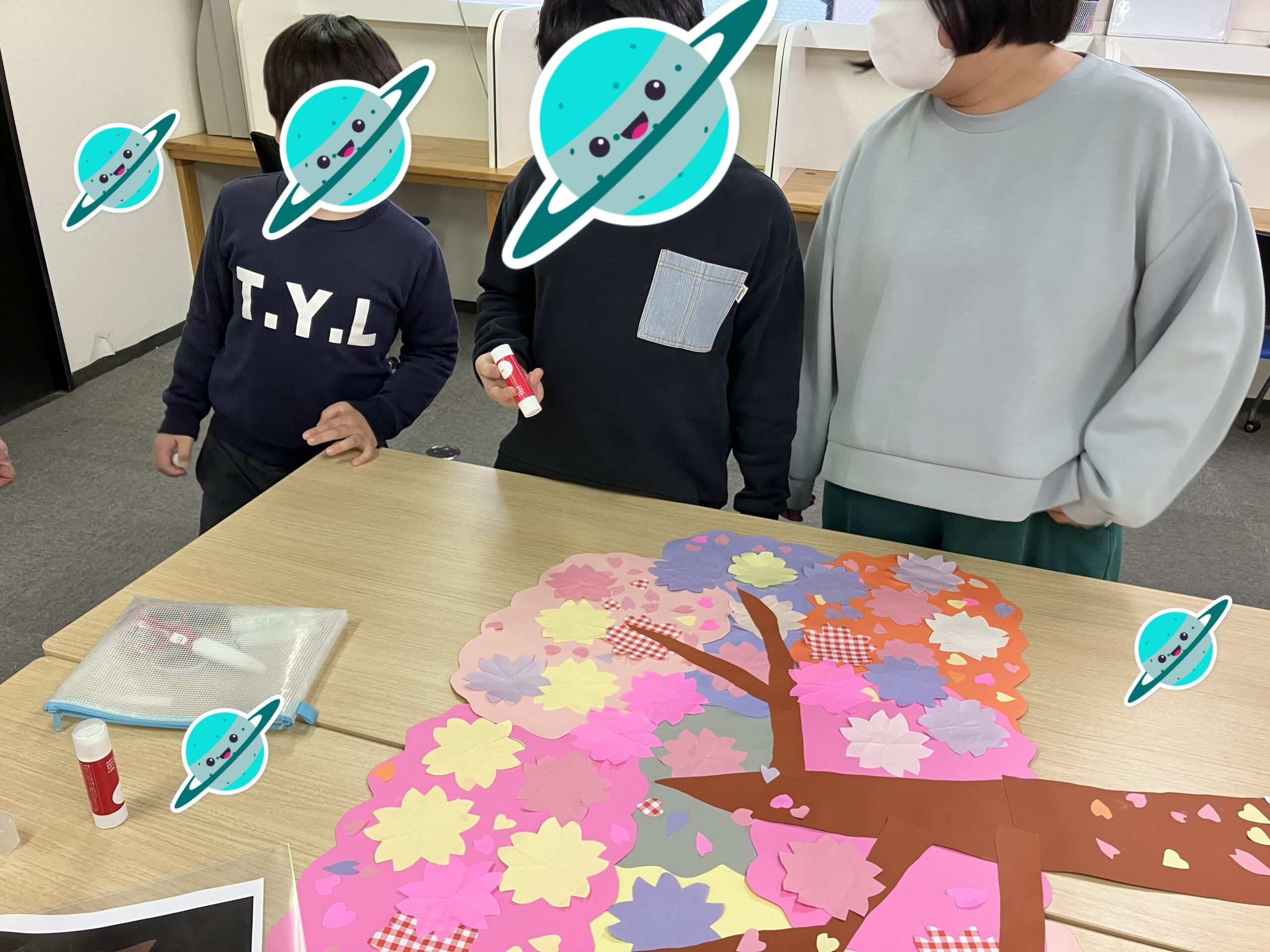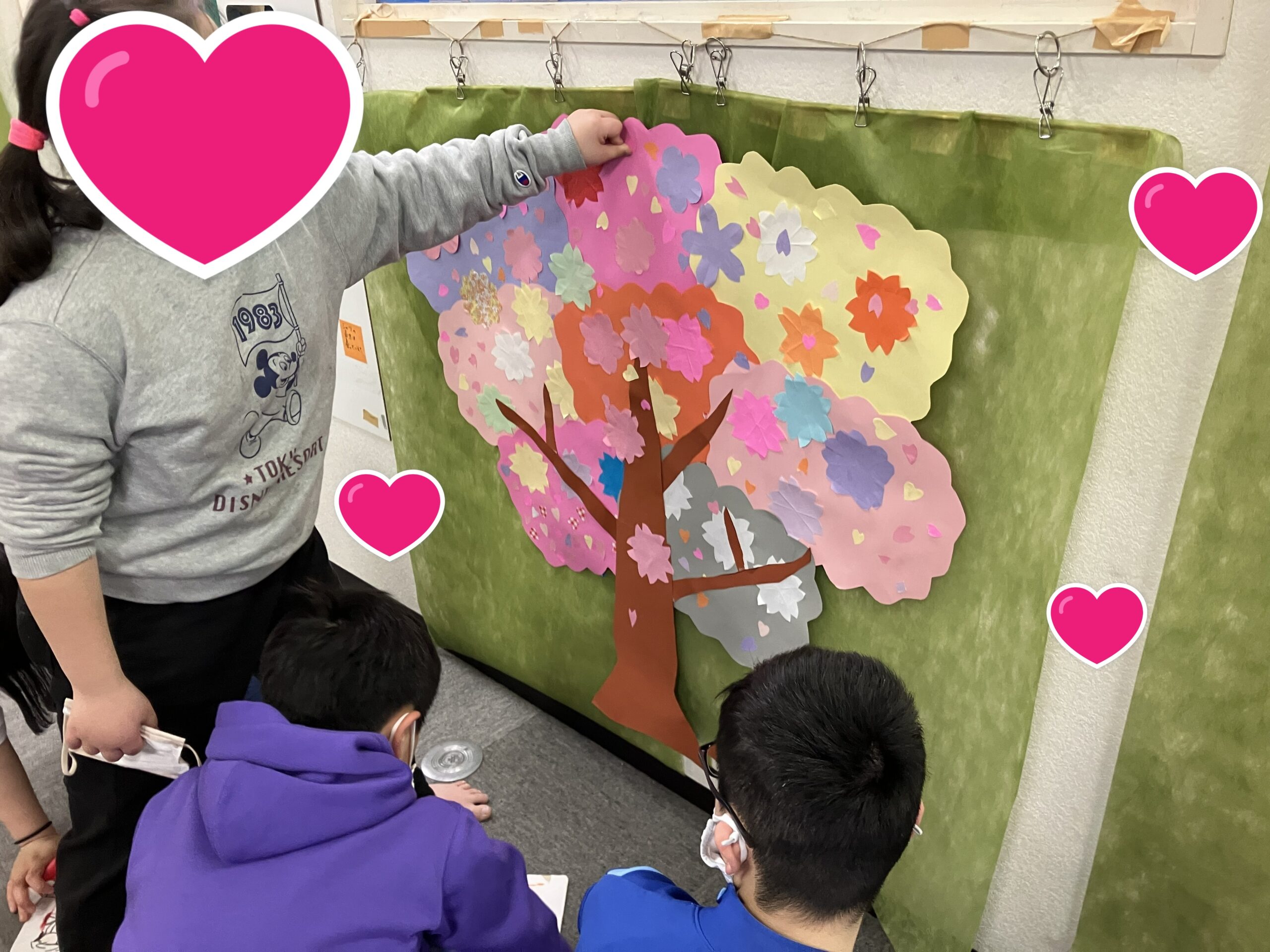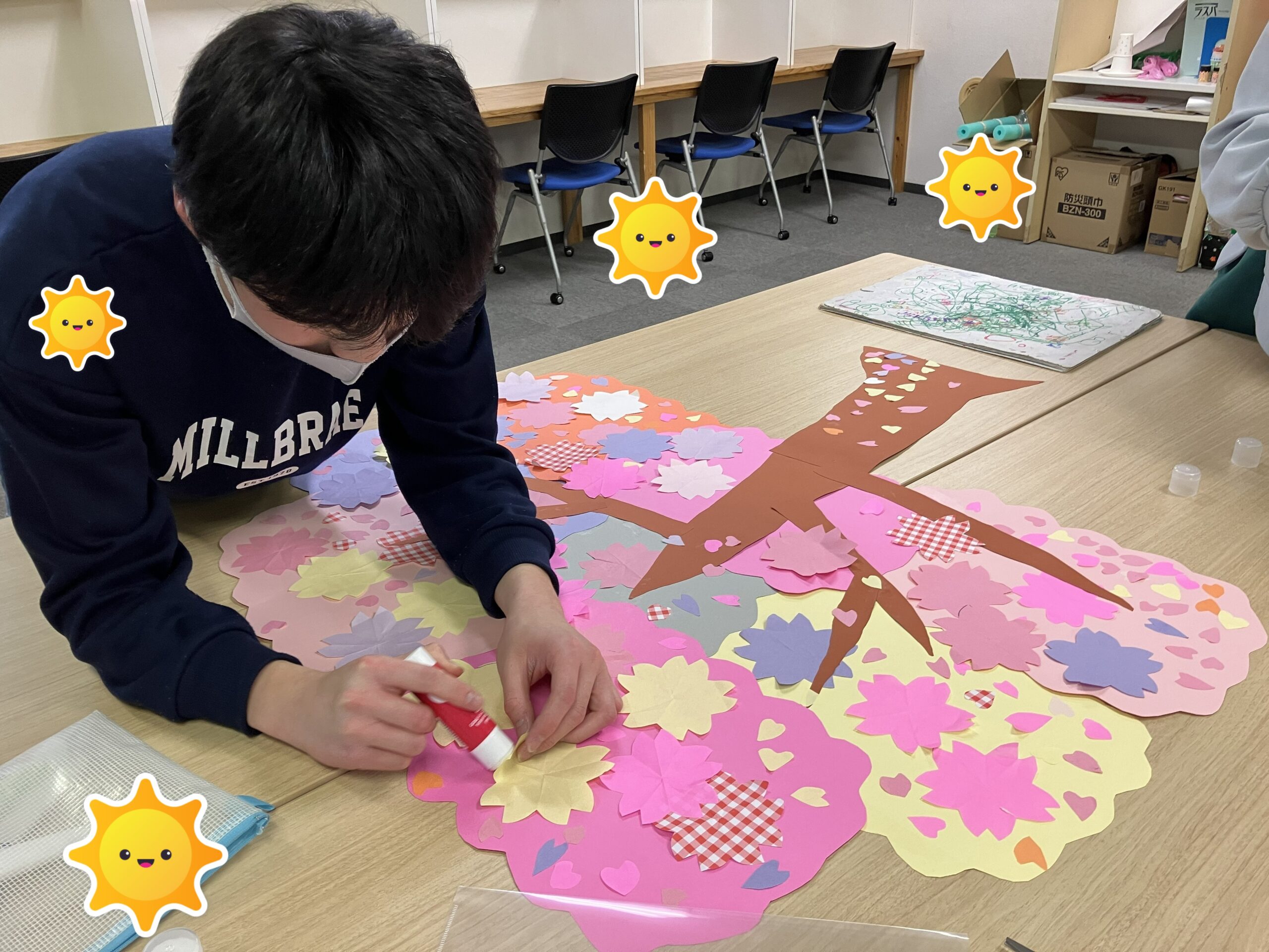 ということで、制作活動のご紹介です。花びらや花の配色も子どもたちが考えながら、貼りつけ作業をしてくださいました。