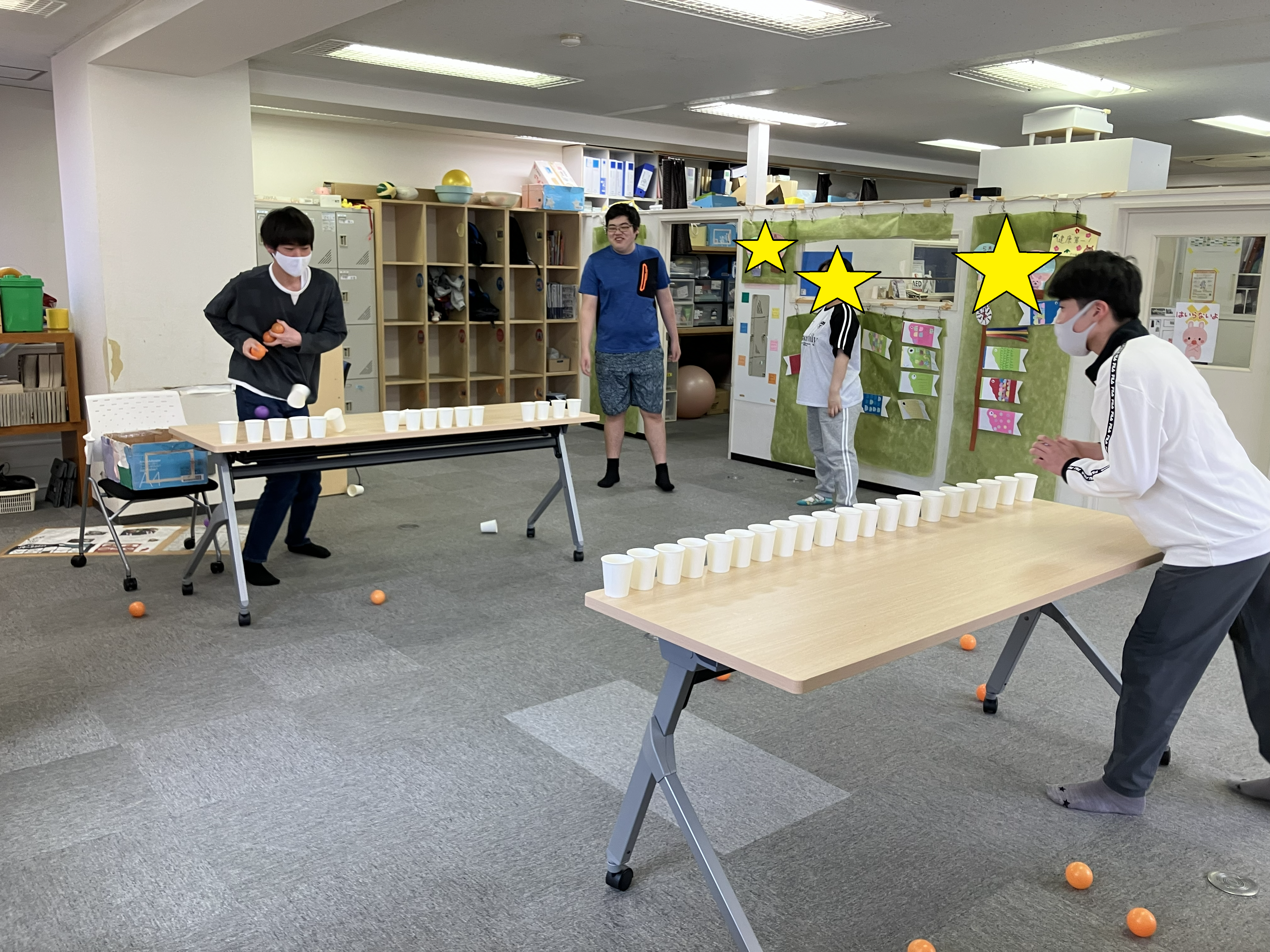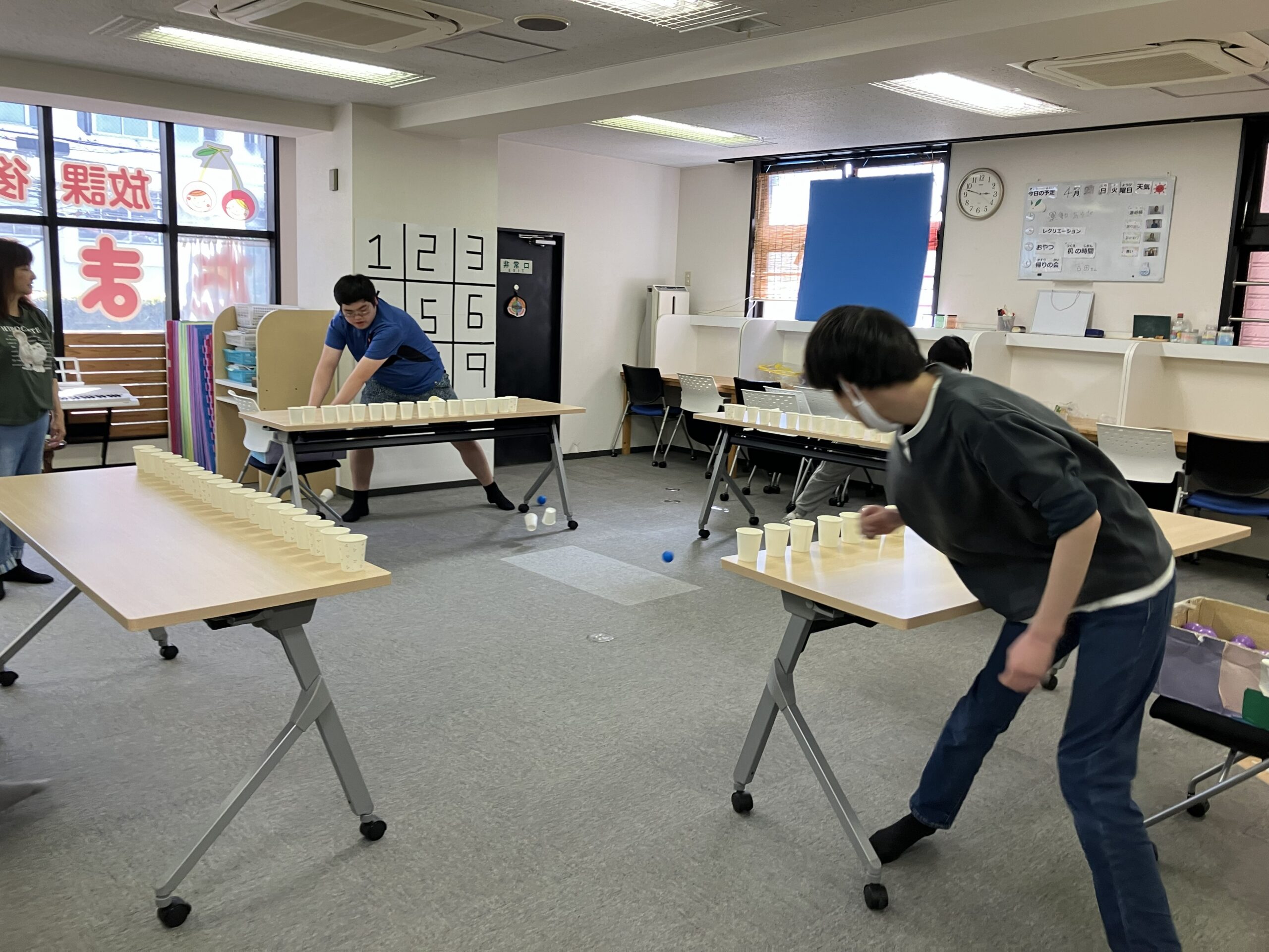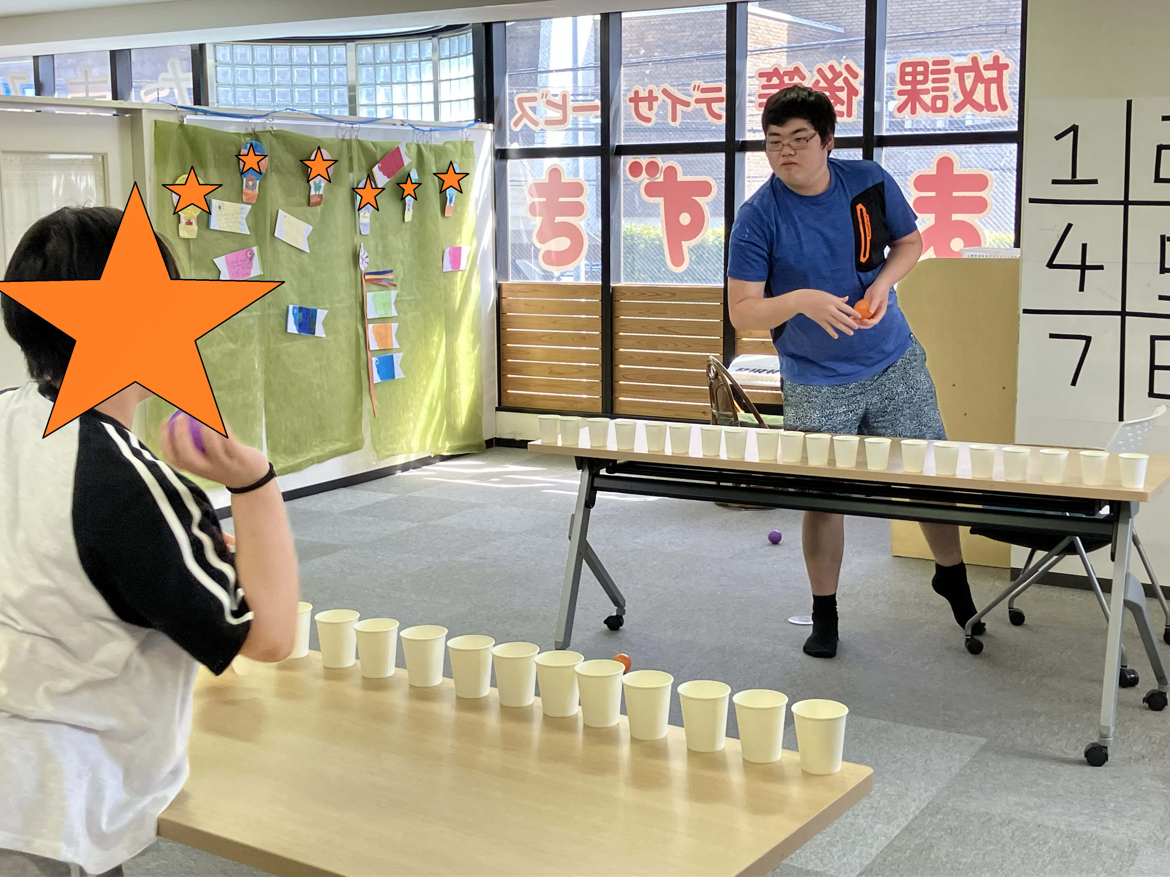 机の上に紙コップを20個並べて、先に相手の紙コップを倒しきった方の勝ちです