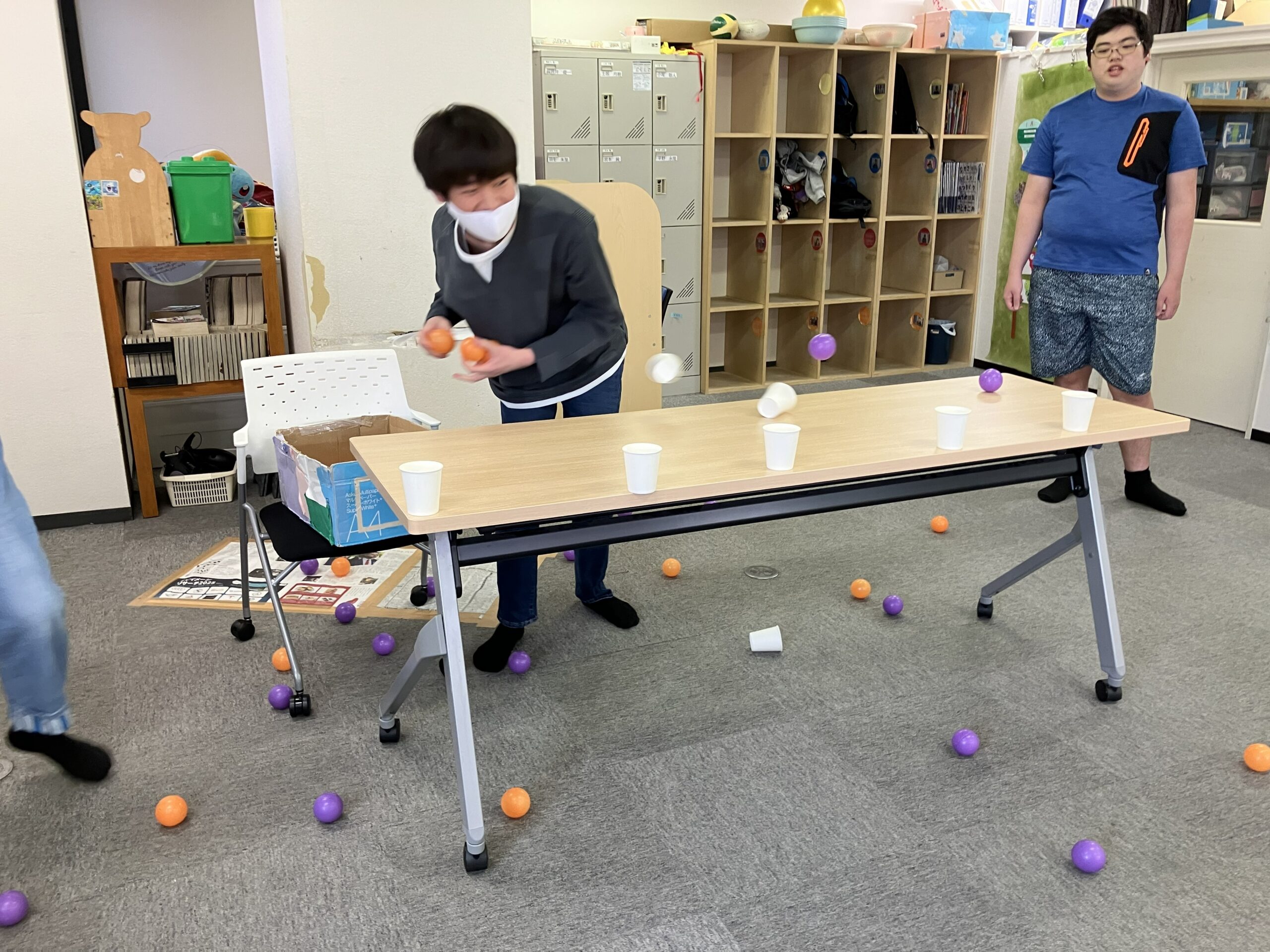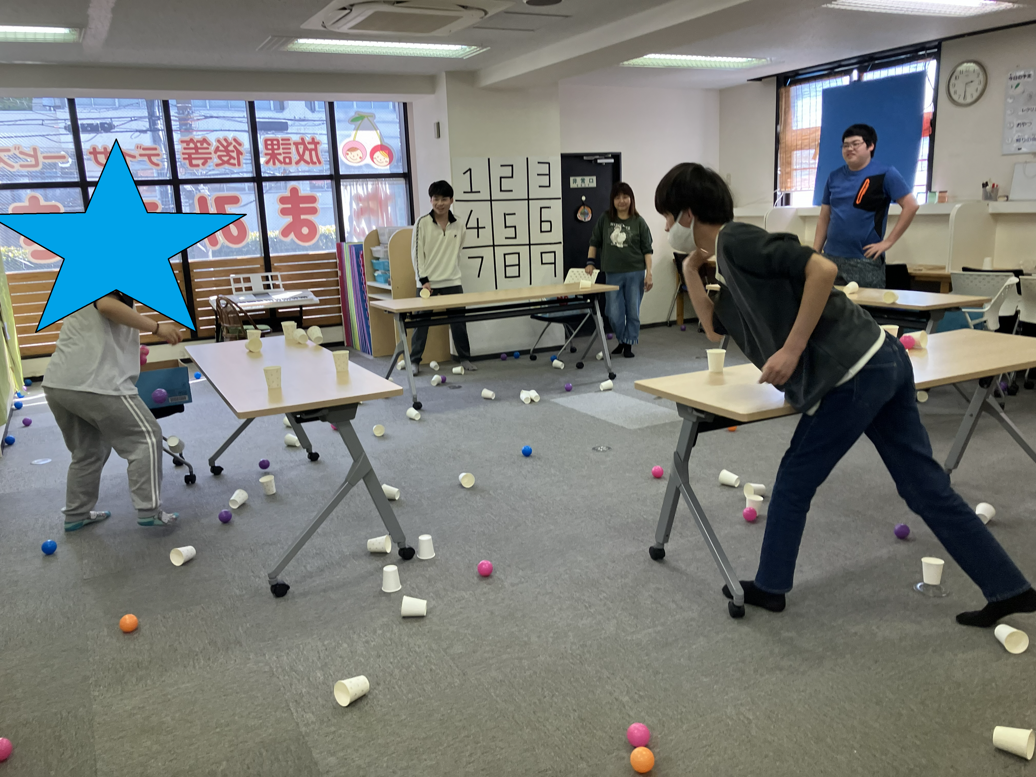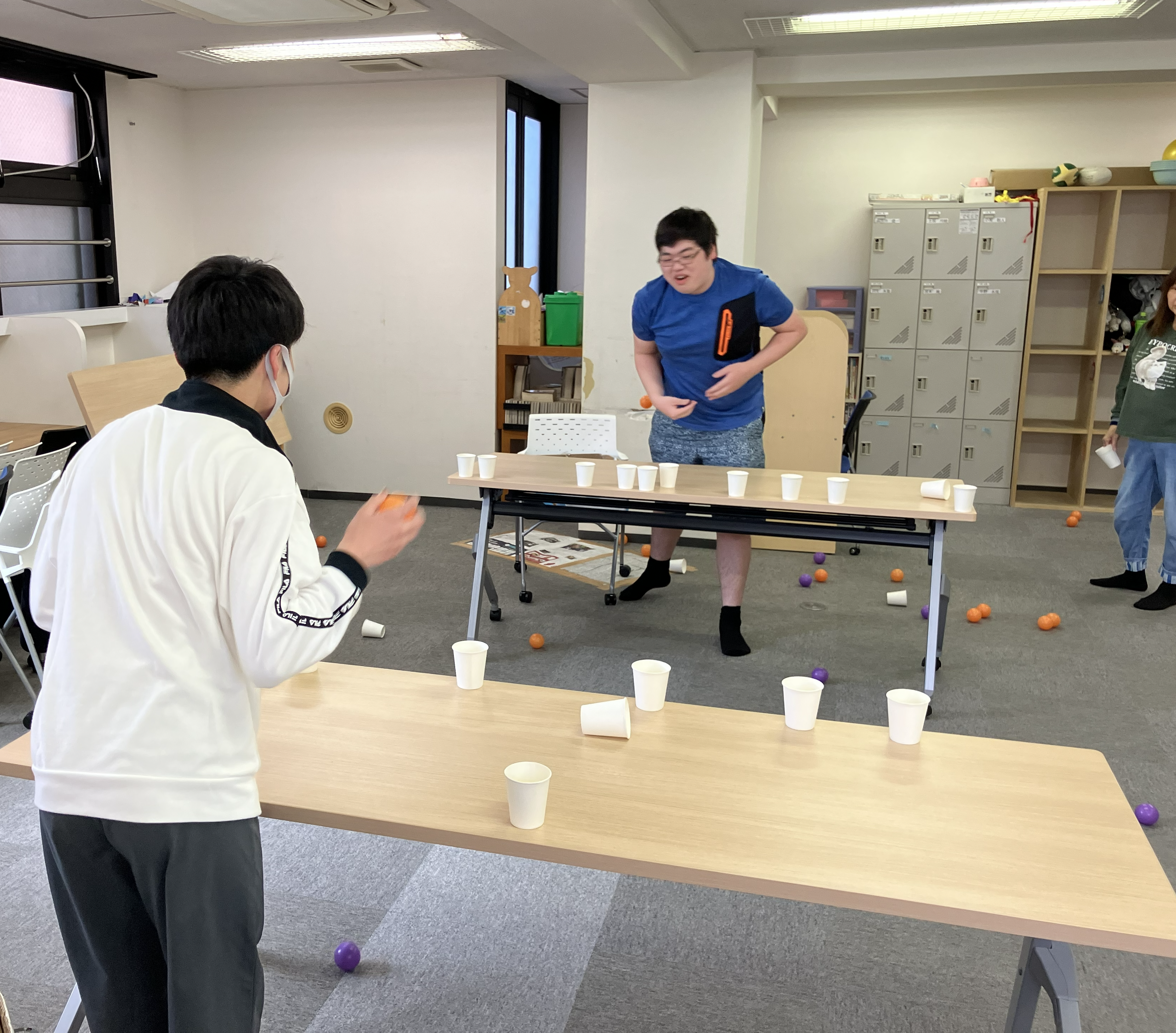 机の上に紙コップを20個並べて、先に相手の紙コップを倒しきった方の勝ちです