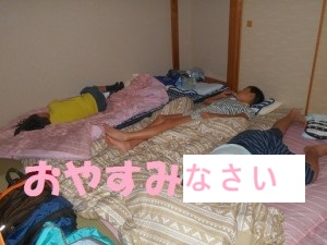 夕食後、寝る場所を決めたり、寝るまでの準備を終え翌日の予定を確認してから消灯しました。写真では、ぐっすりと眠られていますが、いつもと違う夜ということもあり、上の写真に至るまでには少しお話が弾まれていました。